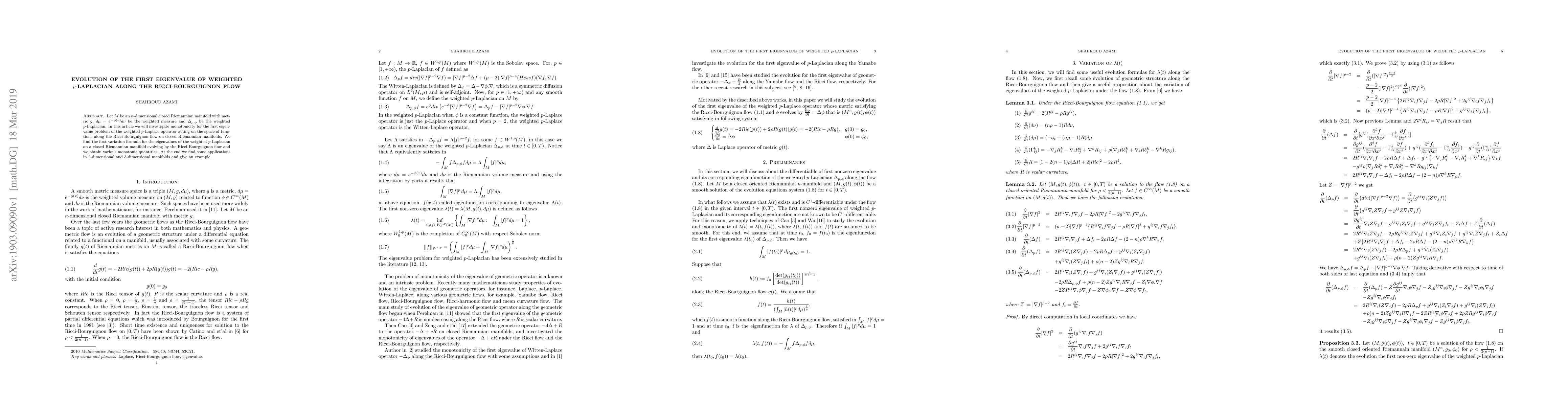 This paper investigates the evolution of the first eigenvalue of the weighted $p$-Laplacian on closed Riemannian manifolds undergoing Ricci-Bourguignon flow, deriving a first variation formula and identifying monotonic quantities. Applications in $2$-dimensional and $3$-dimensional manifolds are provided, along with an illustrative example.