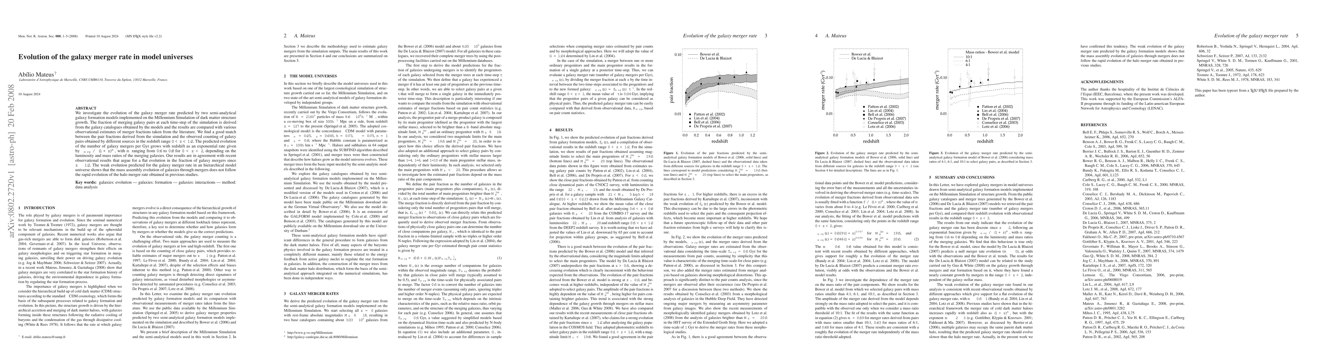 This research uses two semi-analytical galaxy formation models on the Millennium Simulation to study galaxy merger rate evolution. The study finds a good match between simulated and observed galaxy pair fractions in the range 0 < z < 1.2, predicting an exponential growth in galaxy mergers per Gyr with redshift (1+z)^m, where m is 0.6-0.8. The results suggest weak evolution in galaxy merger rate, contrasting with rapid halo merger rate evolution, indicating that galaxy mass assembly through mergers does not mirror halo merger rate rapid evolution.