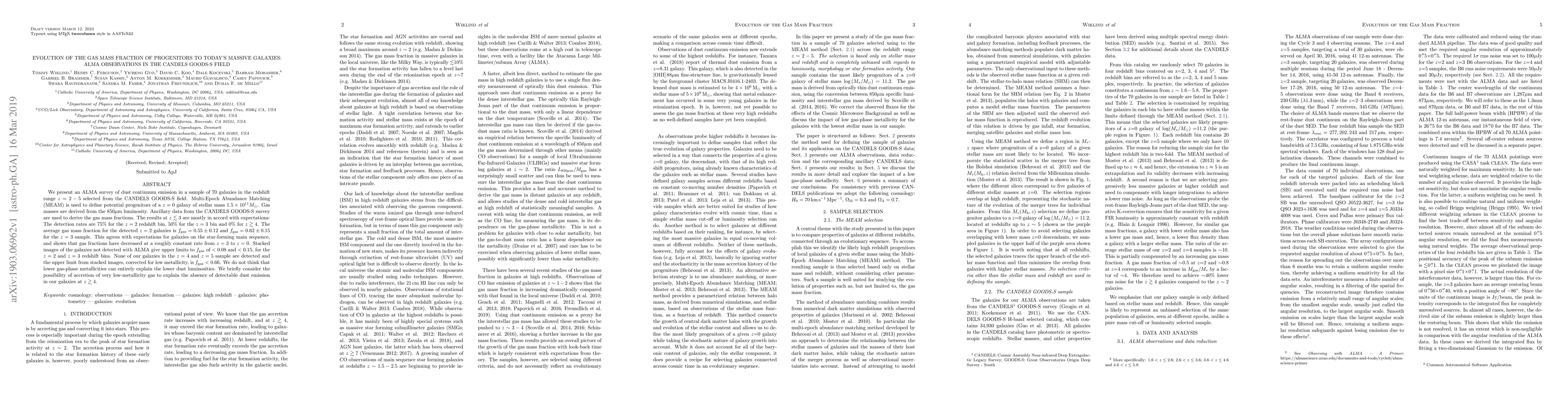 We present an ALMA survey of dust continuum emission in a sample of 70 galaxies in the redshift range z=2-5 selected from the CANDELS GOODS-S field. Multi-Epoch Abundance Matching (MEAM) is used to define potential progenitors of a z = 0 galaxy of stellar mass 1.5 10^11 M_sun. Gas masses are derived from the 850um luminosity. Ancillary data from the CANDELS GOODS-S survey are used to derive the gas mass fractions. The results at z<=3 are mostly in accord with expectations: The detection rates are 75% for the z=2 redshift bin, 50% for the z=3 bin and 0% for z>=4. The average gas mass fraction for the detected z=2 galaxies is f_gas = 0.55+/-0.12 and f_gas = 0.62+/-0.15 for the z=3 sample. This agrees with expectations for galaxies on the star-forming main sequence, and shows that gas fractions have decreased at a roughly constant rate from z=3 to z=0. Stacked images of the galaxies not detected with ALMA give upper limits to f_gas of <0.08 and <0.15, for the z=2 and z=3 redshift bins. None of our galaxies in the z=4 and z=5 sample are detected and the upper limit from stacked images, corrected for low metallicity, is f_gas<0.66. We do not think that lower gas-phase metallicities can entirely explain the lower dust luminosities. We briefly consider the possibility of accretion of very low-metallicity gas to explain the absence of detectable dust emission in our galaxies at z>4.