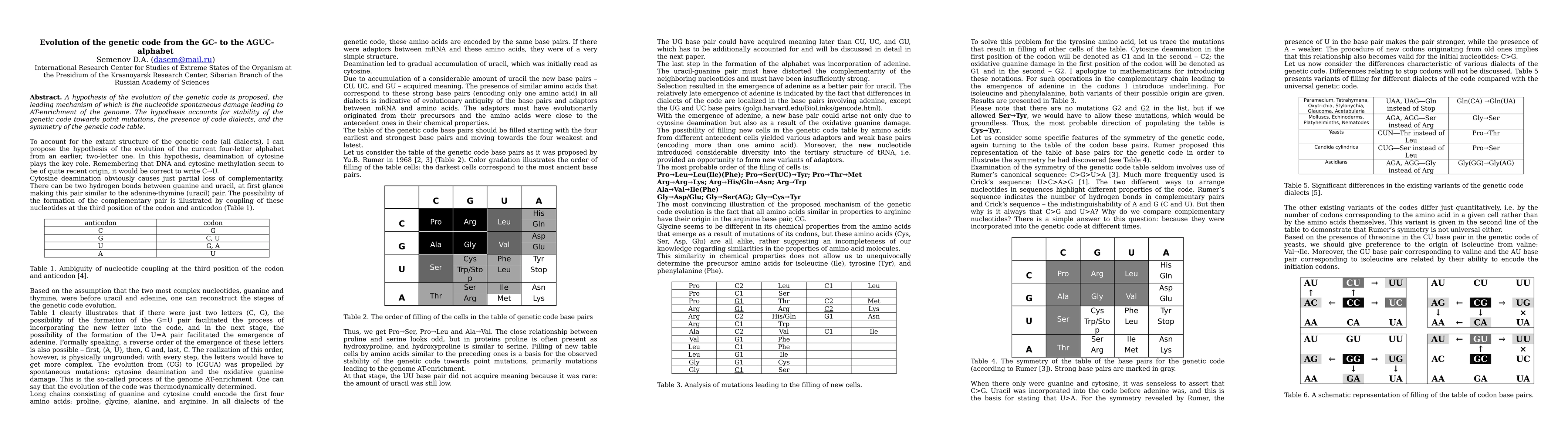 This paper proposes a hypothesis for the evolution of the genetic code, suggesting that nucleotide damage leading to AT-enrichment drove the transition from a GC- to an AGUC-based genetic alphabet, explaining code stability, dialect presence, and symmetry.