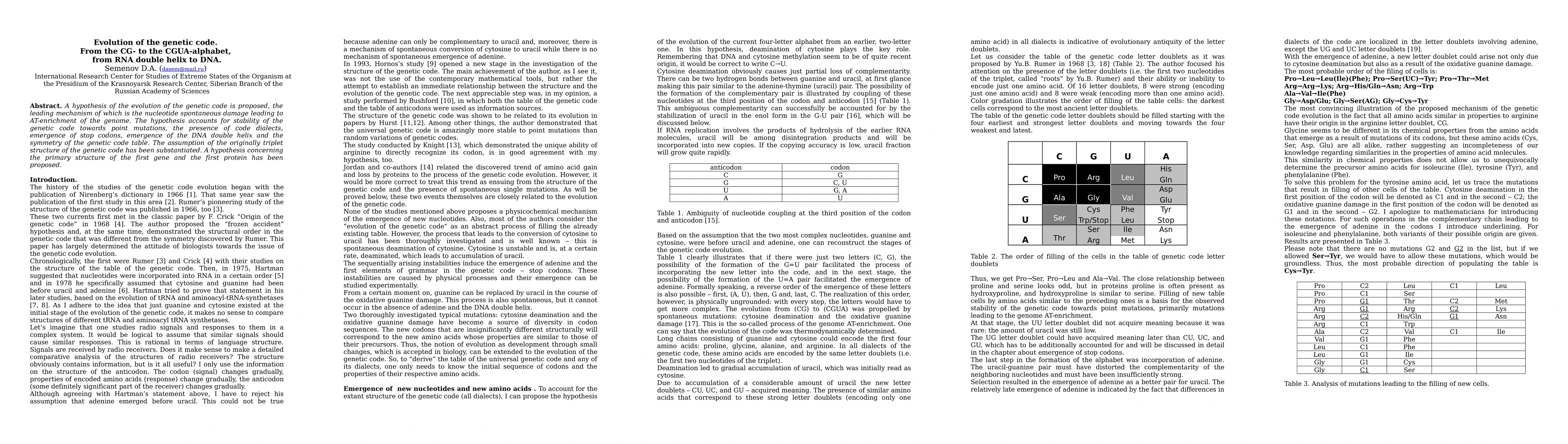 This paper proposes a hypothesis for the evolution of the genetic code, suggesting that nucleotide damage led to AT-enrichment, which stabilized the code and facilitated the transition from RNA to DNA. It also supports the idea of an originally triplet structure and hypothesizes the primary structure of the first gene and protein.