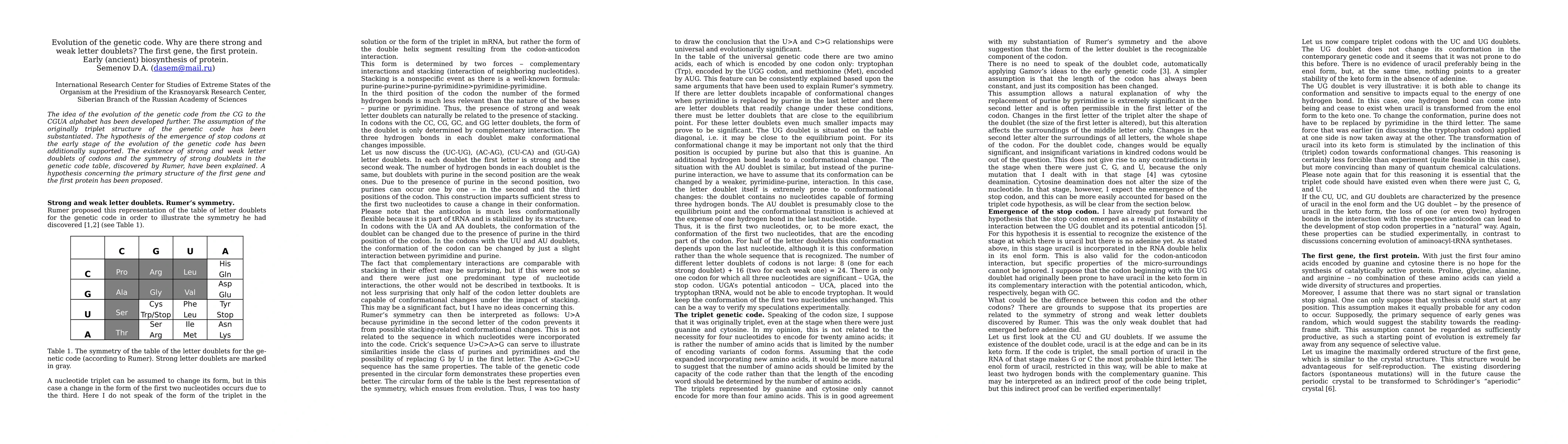 The paper proposes an evolution of the genetic code from a triplet structure, explains the symmetry of strong and weak codon doublets, and hypothesizes the primary structure of the first gene and protein, supporting the early emergence of stop codons.
