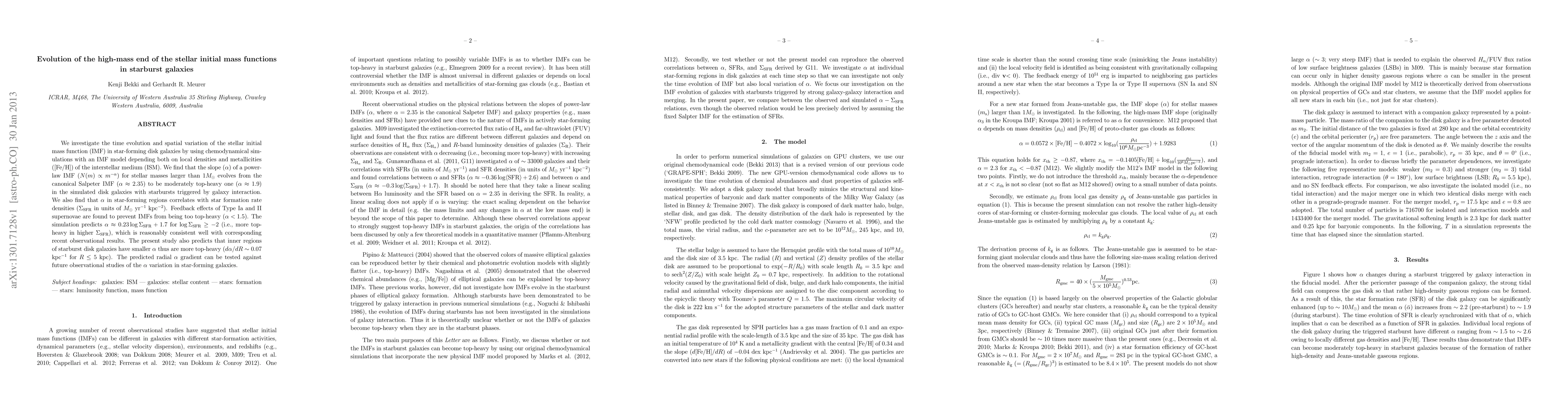 We investigate the time evolution and spatial variation of the stellar initial mass function (IMF) in star-forming disk galaxies by using chemodynamical simulations with an IMF model depending both on local densities and metallicities ([Fe/H]) of the interstellar medium (ISM). We find that the slope (alpha) of a power-law IMF (N(m) ~ m^-alpha) for stellar masses larger than 1M_sun evolves from the canonical Salpeter IMF (alpha ~ 2.35) to be moderately top-heavy one (alpha ~ 1.9) in the simulated disk galaxies with starbursts triggered by galaxy interaction. We also find that alpha in star-forming regions correlates with star formation rate densities (Sigma_SFR in units of M_sun yr^{-1} kpc^{-2}). Feedback effects of Type Ia and II supernovae are found to prevent IMFs from being too top-heavy (alpha < 1.5). The simulation predicts alpha ~ 0.23 log Sigma_SFR + 1.7 for log Sigma_SFR > -2 (i.e., more top-heavy in higher Sigma_SFR), which is reasonably consistent well with corresponding recent observational results. The present study also predicts that inner regions of starburst disk galaxies have smaller alpha thus are more top-heavy (d alpha/d R ~ 0.07 kpc^{-1} for R < 5 kpc). The predicted radial alpha gradient can be tested against future observational studies of the alpha variation in star-forming galaxies.