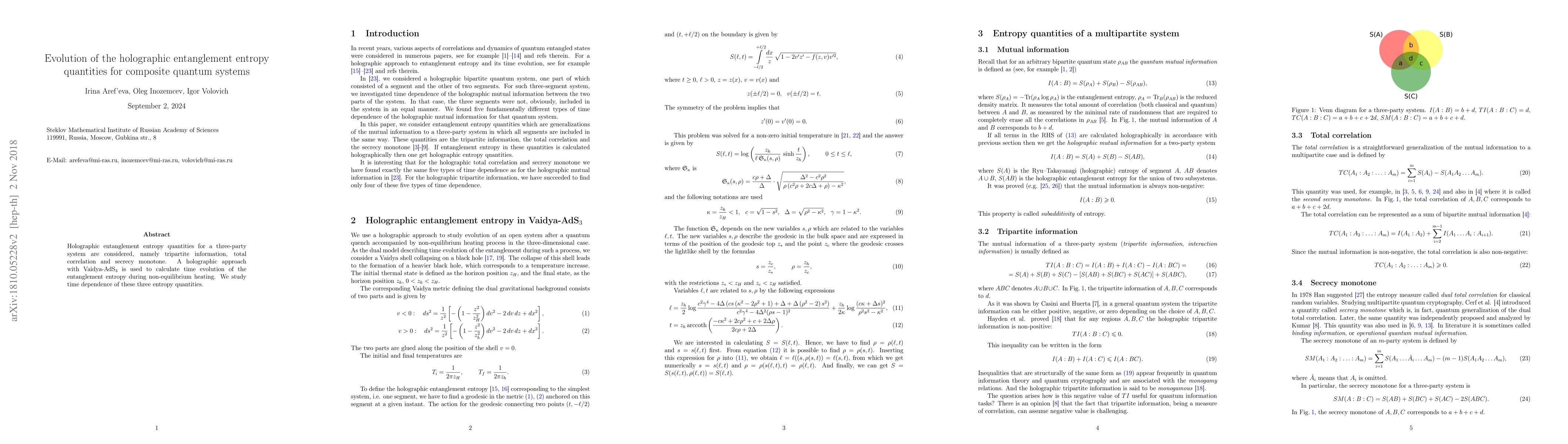 Holographic entanglement entropy quantities for a three-party system are considered, namely tripartite information, total correlation and secrecy monotone. A holographic approach with Vaidya-AdS is used to calculate time evolution of the entanglement entropy during non-equilibrium heating. We study time dependence of these three entropy quantities.