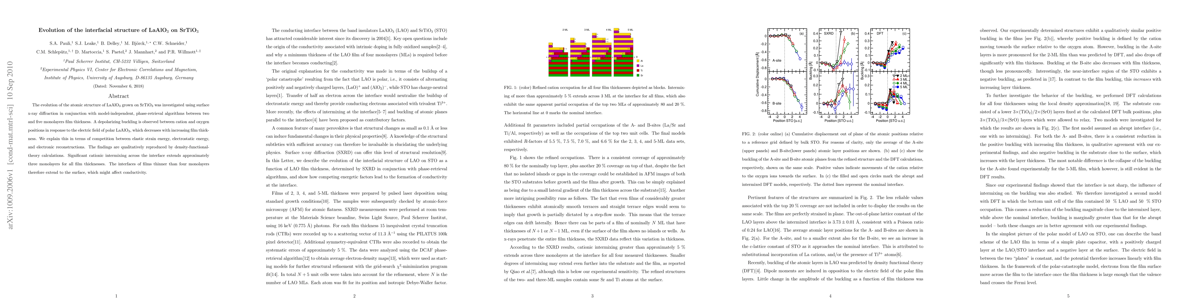 The evolution of the atomic structure of LaAlO3 grown on SrTiO3 was investigated using surface x-ray diffraction in conjunction with model-independent, phase-retrieval algorithms between two and five monolayers film thickness. A depolarizing buckling is observed between cation and oxygen positions in response to the electric field of polar LaAlO3, which decreases with increasing film thickness. We explain this in terms of competition between elastic strain energy, electrostatic energy, and electronic reconstructions. The findings are qualitatively reproduced by density-functional theory calculations. Significant cationic intermixing across the interface extends approximately three monolayers for all film thicknesses. The interfaces of films thinner than four monolayers therefore extend to the surface, which might affect conductivity.