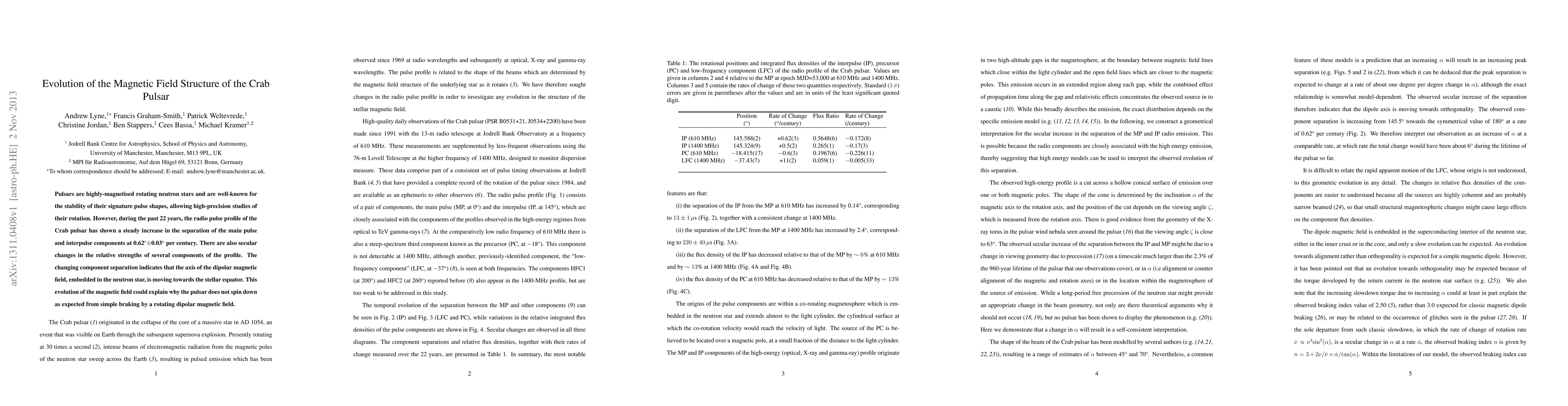 Pulsars are highly-magnetised rotating neutron stars and are well-known for the stability of their signature pulse shapes, allowing high-precision studies of their rotation. However, during the past 22 years, the radio pulse profile of the Crab pulsar has shown a steady increase in the separation of the main pulse and interpulse components at 0.62$^{\rm o}\pm$0.03$^{\rm o}$ per century. There are also secular changes in the relative strengths of several components of the profile. The changing component separation indicates that the axis of the dipolar magnetic field, embedded in the neutron star, is moving towards the stellar equator. This evolution of the magnetic field could explain why the pulsar does not spin down as expected from simple braking by a rotating dipolar magnetic field.