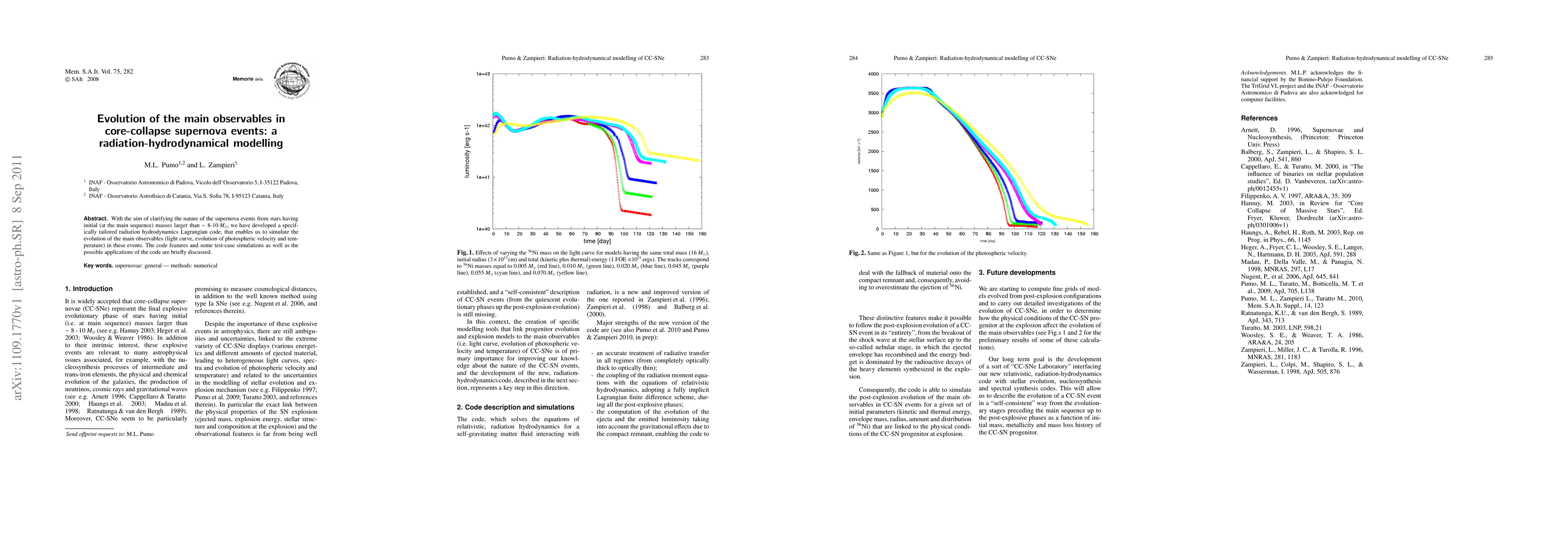 The research developed a specifically tailored radiation hydrodynamics Lagrangian code to simulate the evolution of main observables in core-collapse supernova events, including light curve, photospheric velocity, and temperature.