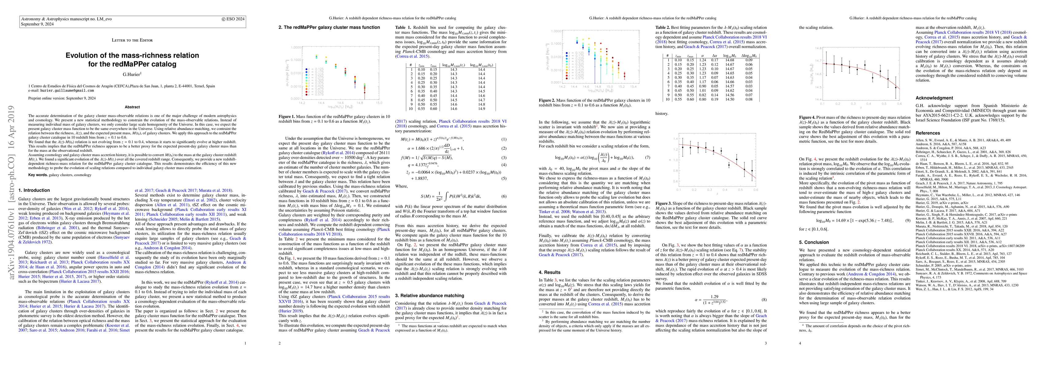 This paper introduces a new statistical method to study the evolution of the mass-richness relation for galaxy clusters using the redMaPPer catalog. The study finds that the richness-mass relationship is stable up to redshift $z=0.4$ but evolves significantly at higher redshifts, indicating the method's effectiveness in probing scaling relations compared to individual cluster mass estimations.