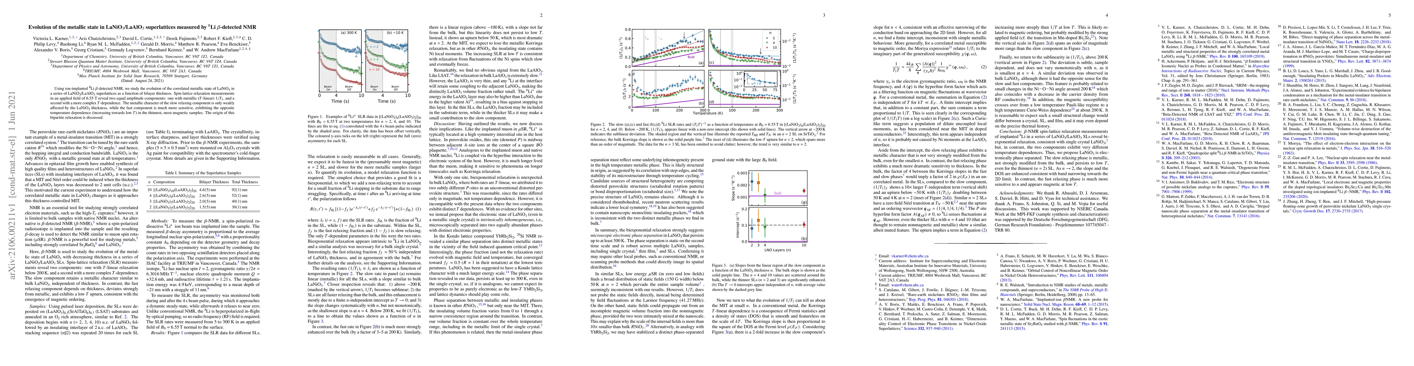 Using ion-implanted $^8$Li $\beta$-detected NMR, we study the evolution of the correlated metallic state of LaNiO$_3$ in a series of LaNiO$_3$/LaAlO$_3$ superlattices as a function of bilayer thickness. Spin-lattice relaxation measurements in an applied field of 6.55 T reveal two equal amplitude components: one with metallic ($T$-linear) $1/T_{1}$, and a second with a more complex $T$-dependence. The metallic character of the slow relaxing component is only weakly affected by the LaNiO$_3$ thickness, while the fast component is much more sensitive, exhibiting the opposite temperature dependence (increasing towards low $T$) in the thinnest, most magnetic samples. The origin of this bipartite relaxation is discussed.
