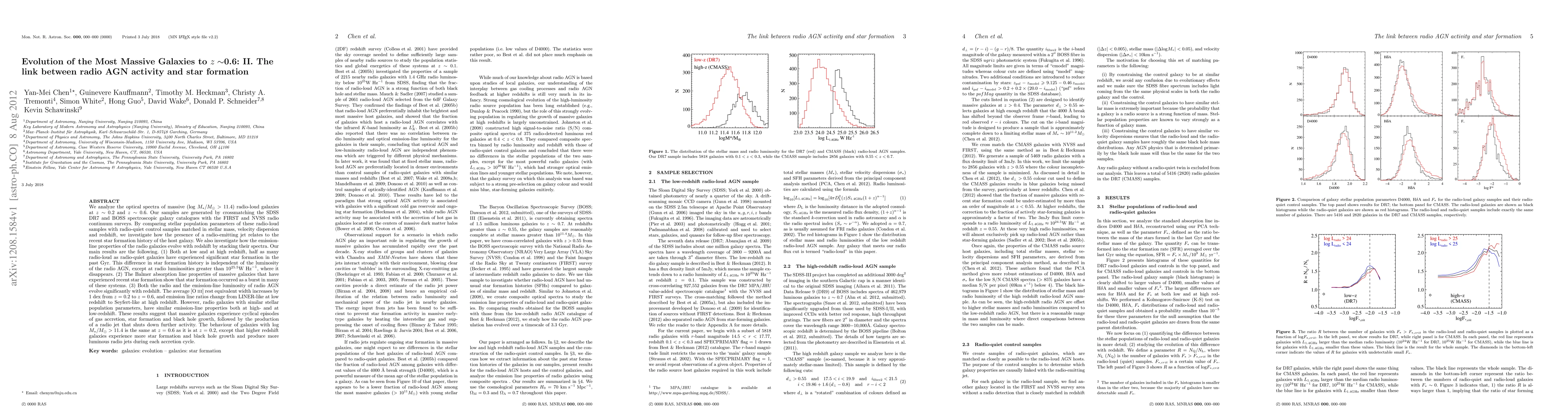 This paper investigates the relationship between radio AGN activity and star formation in massive galaxies at redshifts z~0.2 and z~0.6. It finds that half as many radio-loud galaxies have experienced recent star formation compared to radio-quiet ones, indicating a cyclical pattern of gas accretion, star formation, black hole growth, and radio jet activity. Higher redshift galaxies show more intense star formation and black hole activity, producing more luminous radio jets.