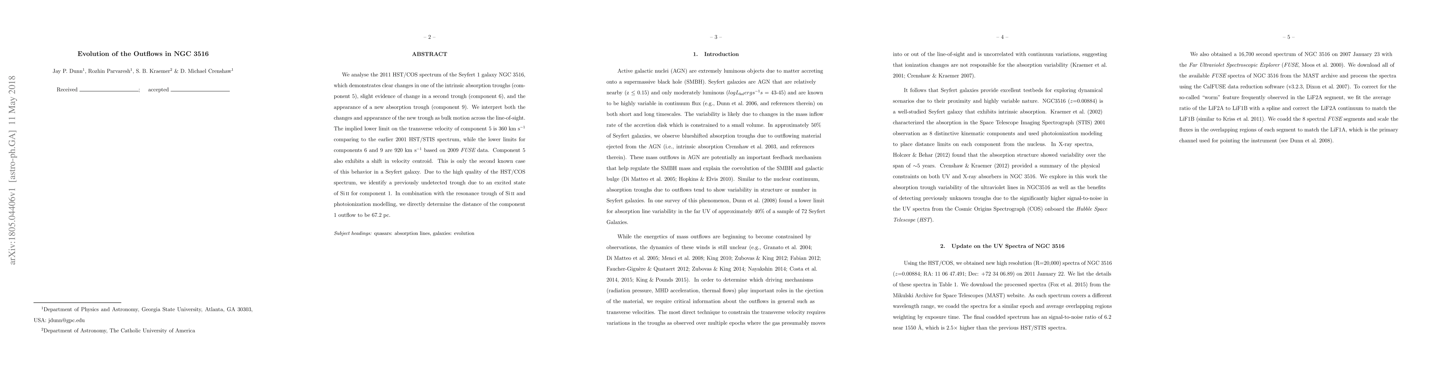 We analyze the 2011 HST/COS spectrum of the Seyfert 1 galaxy NGC 3516, which demonstrates clear changes in one of the intrinsic absorption troughs (component 5), slight evidence of change in a second trough (component 6), and the appearance of a new absorption trough (component 9). We interpret both the changes and the appearance of the new trough as bulk motion across the line of sight. The implied lower limit on the transverse velocity of component 5 is 360 km/s, compared to the earlier 2001 HST/STIS spectrum, while the lower limits for components 6 and 9 are 920 km/s, based on 2009 FUSE data. Component 5 also exhibits a shift in velocity centroid. This is only the second known case of this behavior in a Seyfert galaxy. Due to the high quality of the HST/COS spectrum, we identify a previously undetected trough due to an excited state of Si II for component 1. In combination with the resonance trough of Si II and photoionization modeling, we directly determine the distance of the component 1 outflow to be 67.2 pc.