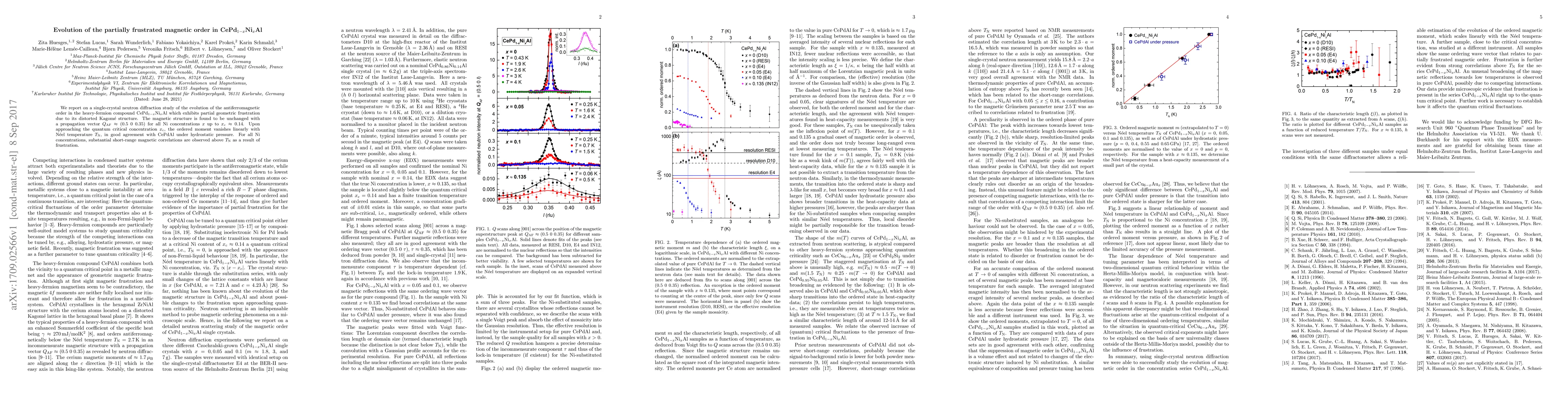 We report on a single-crystal neutron diffraction study of the evolution of the antiferromagnetic order in the heavy-fermion compound CePd$_{1-x}$Ni$_x$Al which exhibits partial geometric frustration due to its distorted Kagom\'e structure. The magnetic structure is found to be unchanged with a propagation vector $Q_\mathrm{AF} \approx (0.5~0~0.35)$ for all Ni concentrations $x$ up to $x_c \approx 0.14$. Upon approaching the quantum critical concentration $x_c$, the ordered moment vanishes linearly with N\'eel temperature $T_{\rm N}$, in good agreement with CePdAl under hydrostatic pressure. For all Ni concentrations, substantial short-range magnetic correlations are observed above $T_{\rm N}$ as a result of frustration.