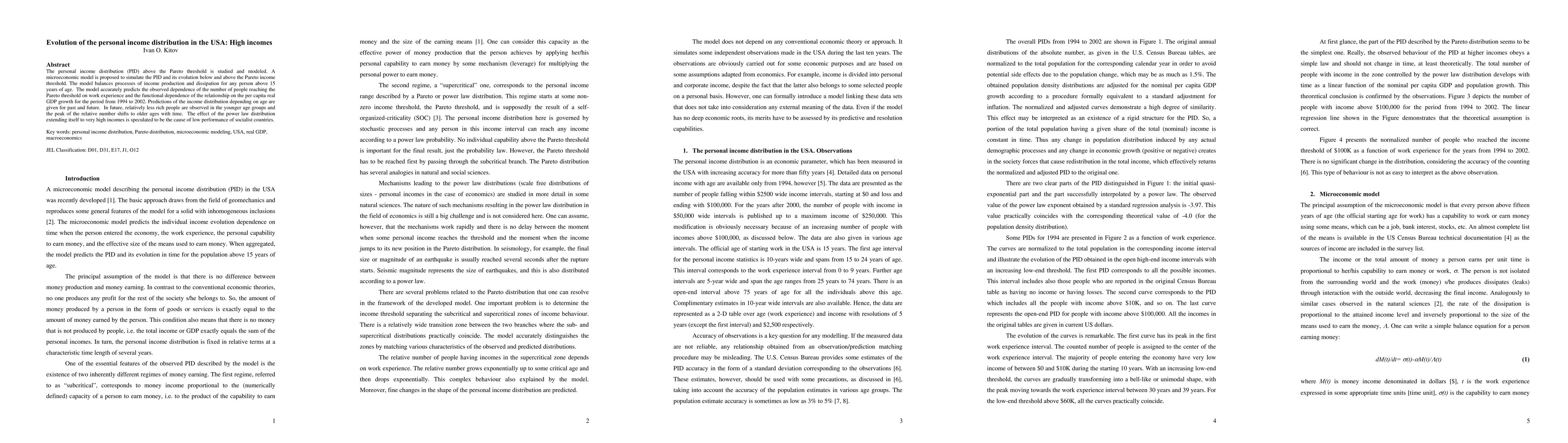 The paper models the evolution of personal income distribution in the USA from 1994 to 2002, predicting that wealth shifts to older age groups over time, with a power law distribution extending to very high incomes. The model accurately captures relationships between GDP growth and income distribution, shedding light on the differences between capitalist and socialist countries.