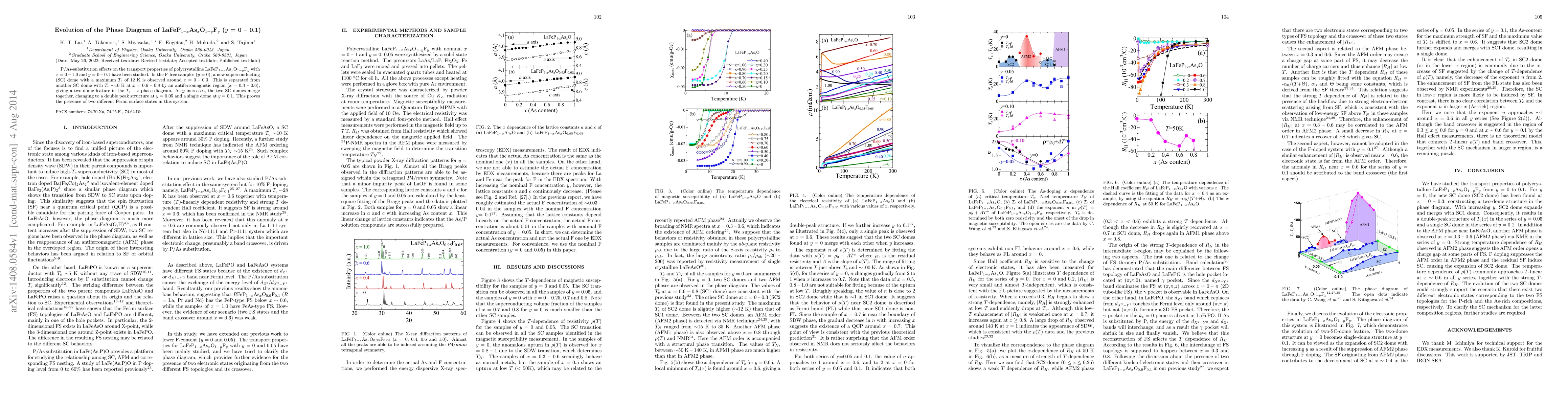 This study investigates the impact of P/As-substitution and fluorine doping on the transport properties of LaFeP$_{1-x}$As$_{x}$O$_{1-y}$F$_{y}$. A two-dome superconducting phase diagram emerges in F-free samples, merging into a single dome with increasing fluorine content, indicating two distinct Fermi surface states.