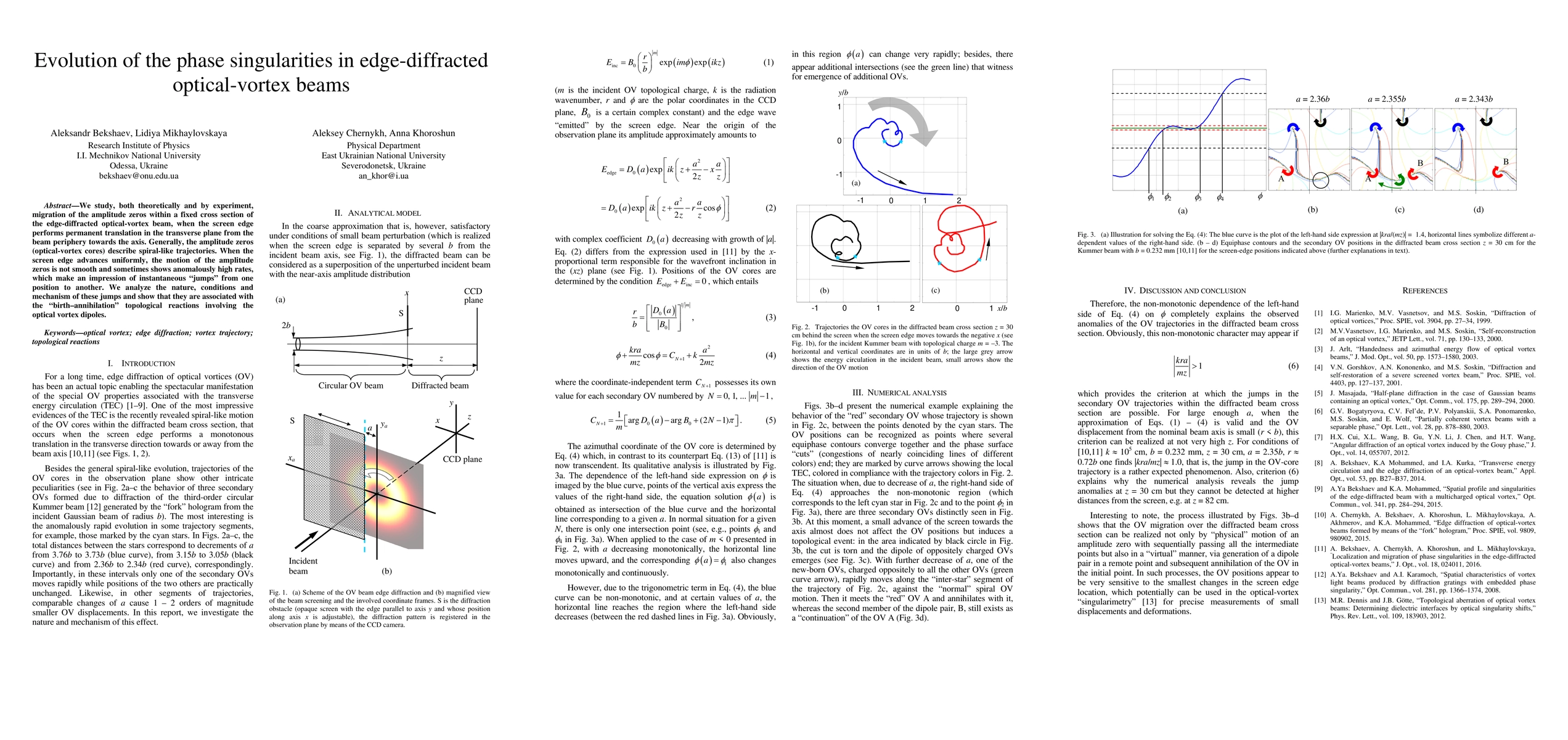 This paper investigates the theoretical and experimental evolution of phase singularities in edge-diffracted optical-vortex beams, focusing on the non-uniform migration of amplitude zeros, or vortex cores, which exhibit "jumps" due to topological reactions involving vortex dipoles. The study reveals the conditions and mechanisms behind these jumps.