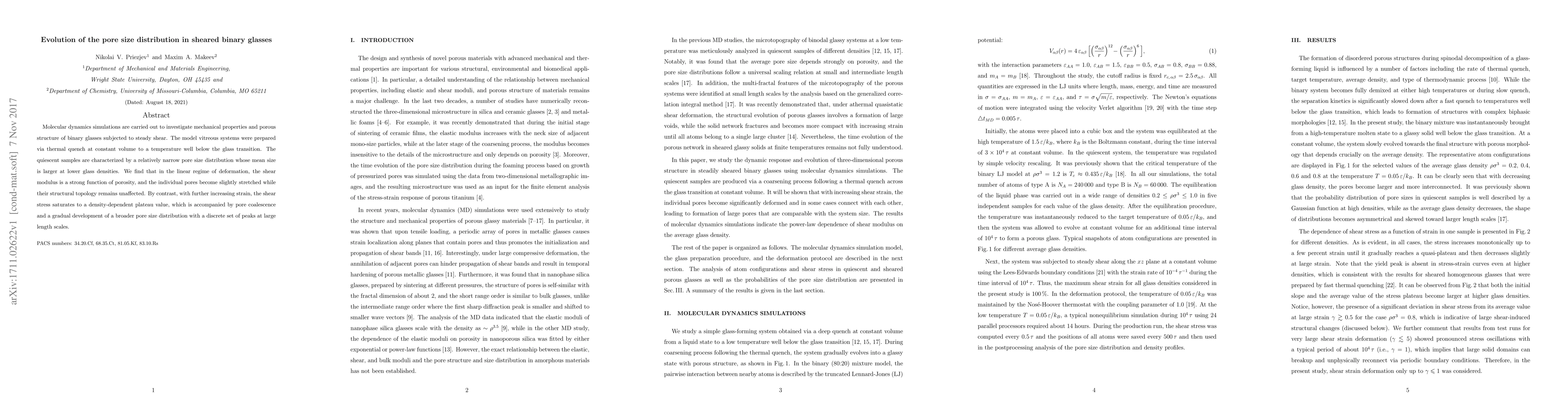 This paper uses molecular dynamics simulations to study the evolution of pore size distribution in binary glasses under shear. Initially, shear slightly stretches pores without altering their topology, but at higher strains, pore coalescence leads to a broader pore size distribution and a density-dependent plateau in shear stress.