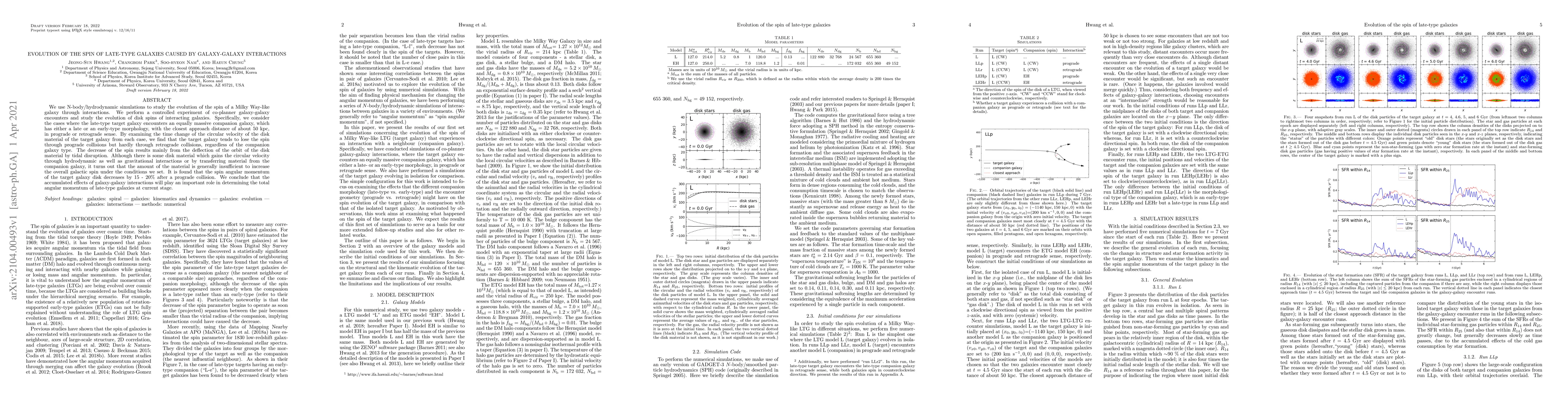 We use N-body/hydrodynamic simulations to study the evolution of the spin of a Milky Way-like galaxy through interactions. We perform a controlled experiment of co-planner galaxy-galaxy encounters and study the evolution of disk spins of interacting galaxies. Specifically, we consider the cases where the late-type target galaxy encounters an equally massive companion galaxy, which has either a late or an early-type morphology, with the closest approach distance of about 50 kpc, in prograde or retrograde sense. By examining the time change of the circular velocity of the disk material of the target galaxy from each case, we find that the target galaxy tends to lose the spin through prograde collisions but hardly through retrograde collisions, regardless of the companion galaxy type. The decrease of the spin results mainly from the deflection of the orbit of the disk material by tidal disruption. Although there is some disk material which gains the circular velocity through hydrodynamic as well as gravitational interactions or by transferring material from the companion galaxy, it turns out that the amount of the material is generally insufficient to increase the overall galactic spin under the conditions we set. It is found that the spin angular momentum of the target galaxy disk decreases by 15 - 20% after a prograde collision. We conclude that the accumulated effects of galaxy-galaxy interactions will play an important role in determining the total angular momentum of late-type galaxies at current stage.