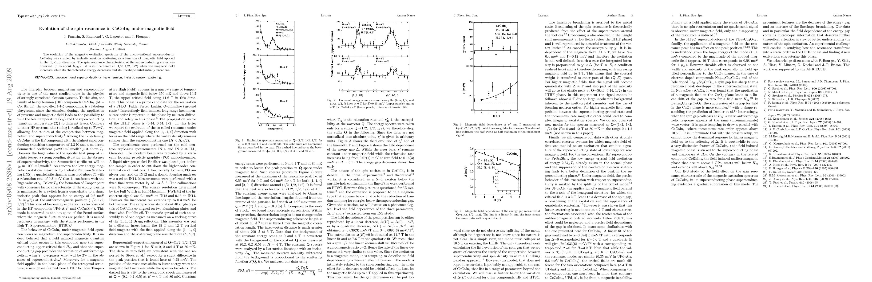 Researchers studied CeCoIn$_5$, an unconventional superconductor, under varying magnetic fields using inelastic neutron scattering. They found the spin resonance characteristic of its superconducting states shifted but remained centered at (1/2, 1/2, 1/2) while broadening and decreasing in energy.