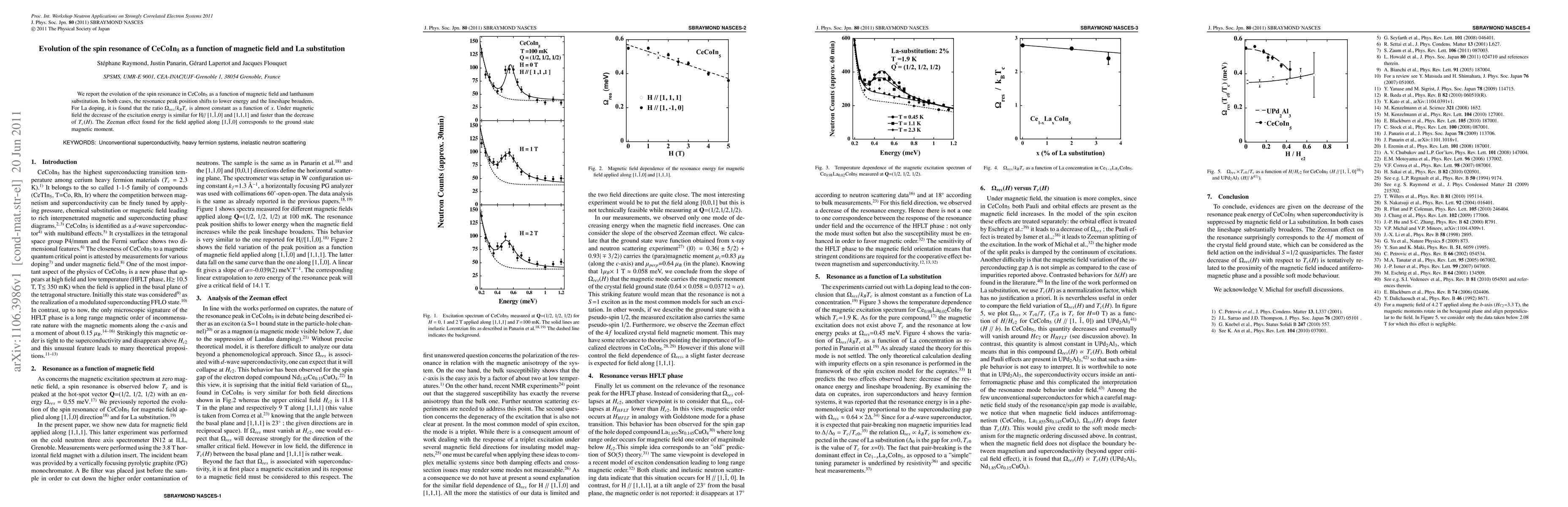 We report the evolution of the spin resonance in CeCoIn$_{5}$ as a function of magnetic field and lanthanum substitution. In both cases, the resonance peak position shifts to lower energy and the lineshape broadens. For La doping, it is found that the ratio $\Omega_{res}/k_{B}T_{c}$ is almost constant as a function of $x$. Under magnetic field the decrease of the excitation energy is similar for H// [1,$\bar{1}$,0] and [1,1,1] and faster than the decrease of $T_{c}(H)$. The Zeeman effect found for the field applied along [1,$\bar{1}$,0] corresponds to the ground state magnetic moment.