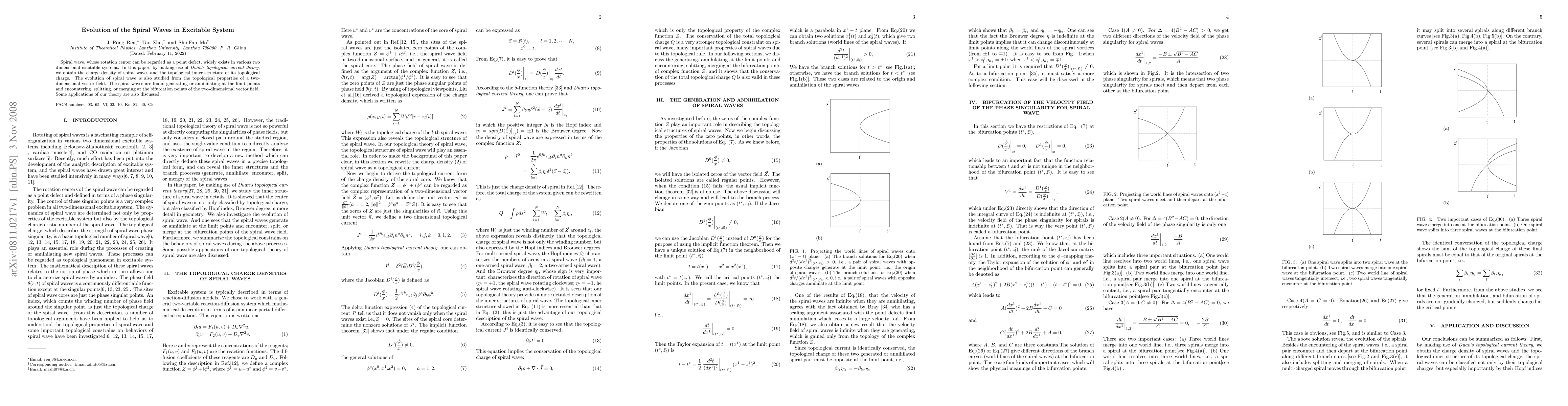 Spiral wave, whose rotation center can be regarded as a point defect, widely exists in various two dimensional excitable systems. In this paper, by making use of \emph{Duan's topological current theory}, we obtain the charge density of spiral waves and the topological inner structure of its topological charge. The evolution of spiral wave is also studied from the topological properties of a two-dimensional vector field. The spiral waves are found generating or annihilating at the limit points and encountering, splitting, or merging at the bifurcation points of the two-dimensional vector field. Some applications of our theory are also discussed.