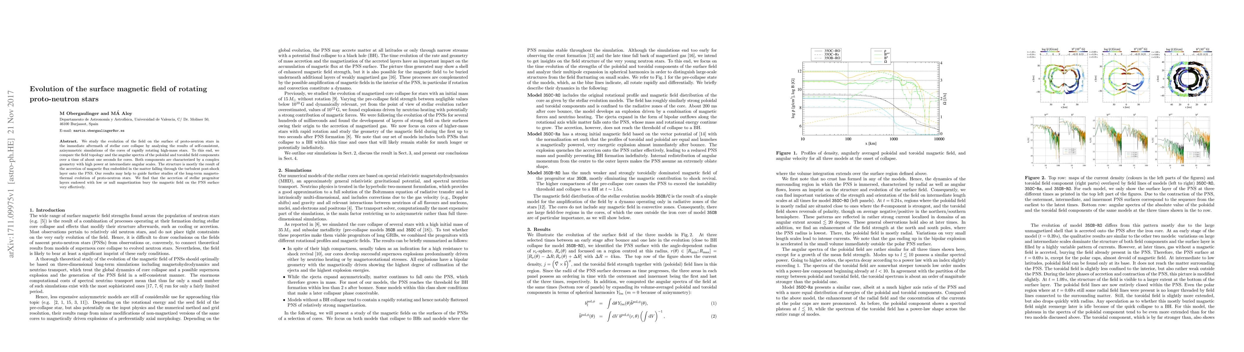 We study the evolution of the field on the surface of proto-neutron stars in the immediate aftermath of stellar core collapse by analyzing the results of self-consistent, axisymmetric simulations of the cores of rapidly rotating high-mass stars. To this end, we compare the field topology and the angular spectra of the poloidal and toroidal field components over a time of about one seconds for cores. Both components are characterized by a complex geometry with high power at intermediate angular scales. The structure is mostly the result of the accretion of magnetic flux embedded in the matter falling through the turbulent post-shock layer onto the PNS. Our results may help to guide further studies of the long-term magnetothermal evolution of proto-neutron stars. We find that the accretion of stellar progenitor layers endowed with low or null magnetization bury the magnetic field on the PNS surface very effectively.