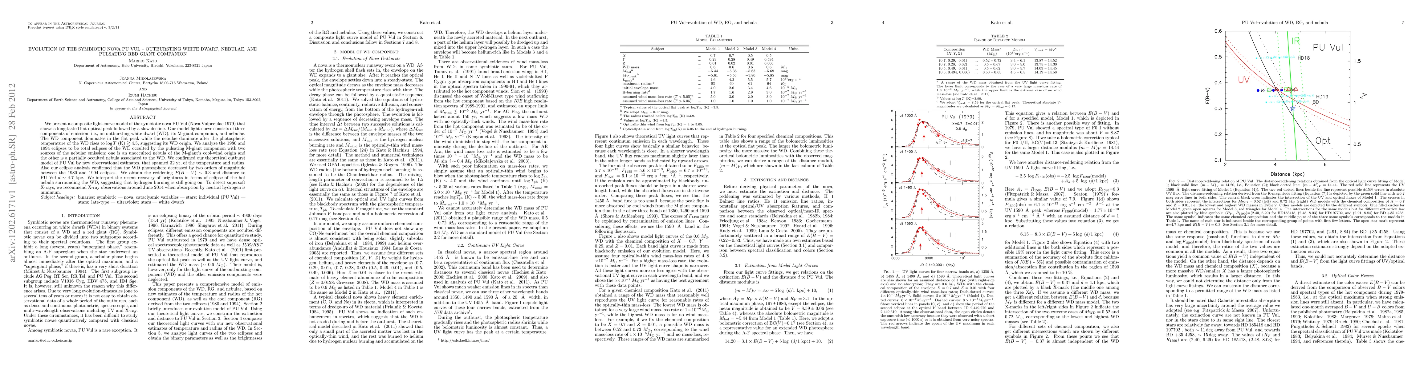 We present a composite light-curve model of the symbiotic nova PU Vul (Nova Vulpeculae 1979) that shows a long-lasted flat optical peak followed by a slow decline. Our model light-curve consists of three components of emission, i.e., an outbursting white dwarf (WD), its M-giant companion, and nebulae. The WD component dominates in the flat peak while the nebulae dominate after the photospheric temperature of the WD rises to log T (K) >~ 4.5, suggesting its WD origin. We analyze the 1980 and 1994 eclipses to be total eclipses of the WD occulted by the pulsating M-giant companion with two sources of the nebular emission; one is an unocculted nebula of the M-giant's cool-wind origin and the other is a partially occulted nebula associated to the WD. We confirmed our theoretical outburst model of PU Vul by new observational estimates, that spanned 32 yr, of the temperature and radius. Also our eclipse analysis confirmed that the WD photosphere decreased by two orders of magnitude between the 1980 and 1994 eclipses. We obtain the reddening E(B-V) ~ 0.3 and distance to PU Vul d ~ 4.7 kpc. We interpret the recent recovery of brightness in terms of eclipse of the hot nebula surrounding the WD, suggesting that hydrogen burning is still going on. To detect supersoft X-rays, we recommend X-ray observations around June 2014 when absorption by neutral hydrogen is minimum.