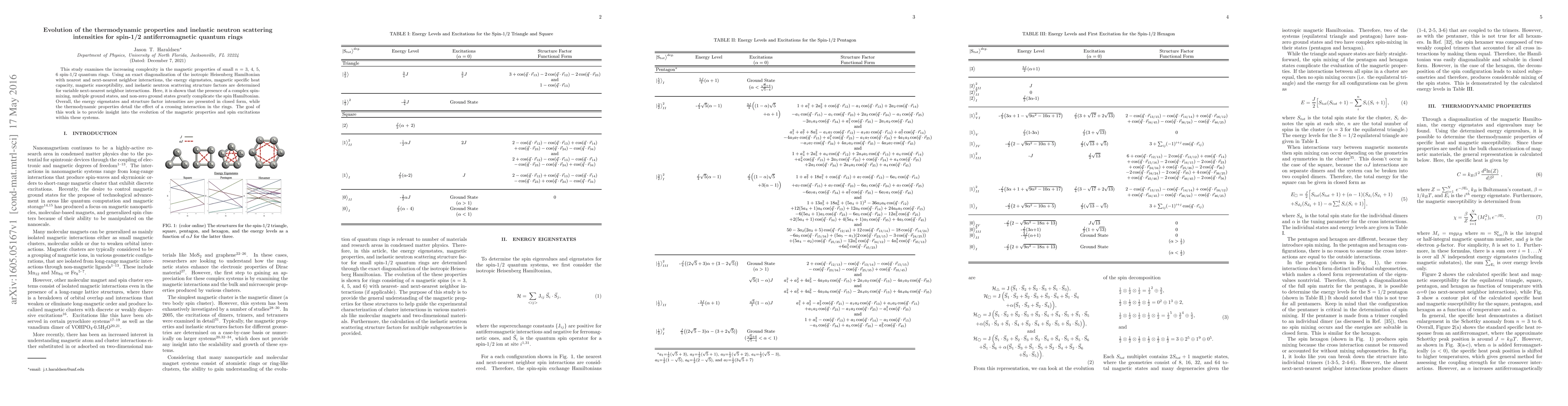 This study examines the increasing complexity in the magnetic properties of small $n$ = 3, 4, 5, 6 spin-1/2 quantum rings. Using an exact diagonalization of the isotropic Heisenberg Hamiltonian with nearest and next-nearest neighbor interactions, the energy eigenstates, magnetic specific heat capacity, magnetic susceptibility, and inelastic neutron scattering structure factors are determined for variable next-nearest neighbor interactions. Here, it is shown that the presence of a complex spin-mixing, multiple ground states, and non-zero ground states greatly complicate the spin Hamiltonian. Overall, the energy eigenstates and structure factor intensities are presented in closed form, while the thermodynamic properties detail the effect of a crossing interaction in the rings. The goal of this work is to provide insight into the evolution of the magnetic properties and spin excitations within these systems.