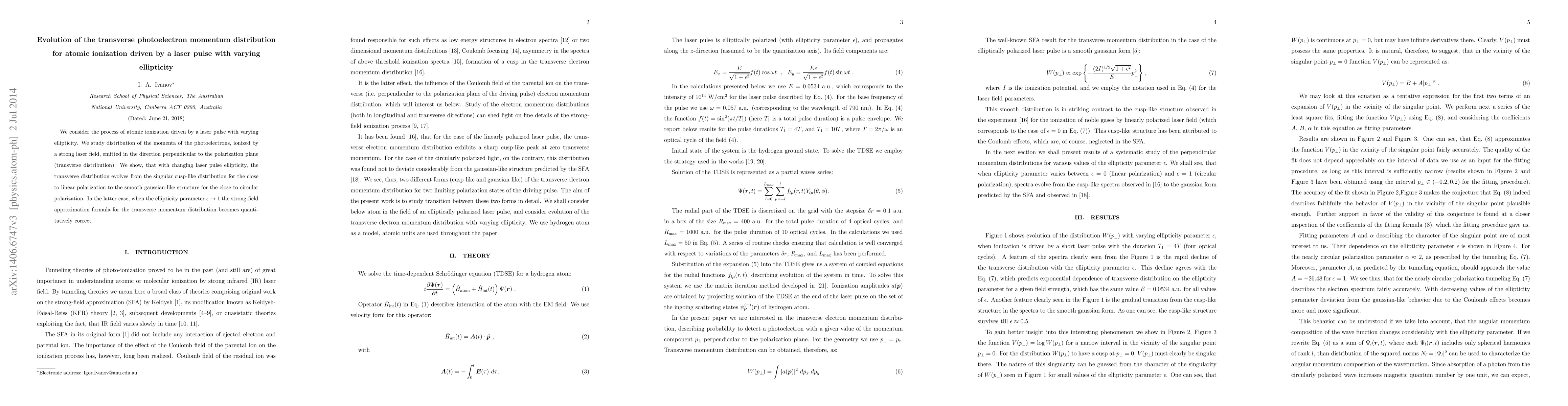 This paper investigates how the transverse photoelectron momentum distribution changes with varying ellipticity of a laser pulse driving atomic ionization. The study reveals that the distribution transitions from a cusp-like shape for linear polarization to a Gaussian-like shape for circular polarization, with the strong-field approximation becoming accurate as the ellipticity approaches unity.