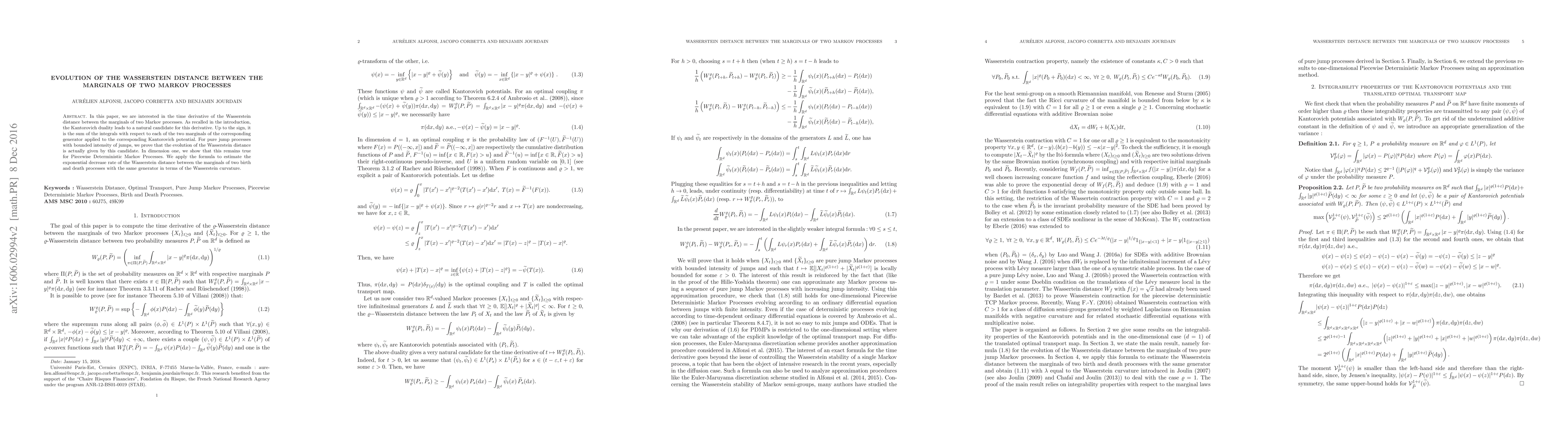 Summary: This paper examines the time derivative of the Wasserstein distance between the marginals of two Markov processes, showing that for processes with bounded jump intensity, this derivative is given by the sum of integrals involving the corresponding generators and Kantorovich potentials. It further applies this result to estimate the exponential decay rate of the Wasserstein distance for birth and death processes.