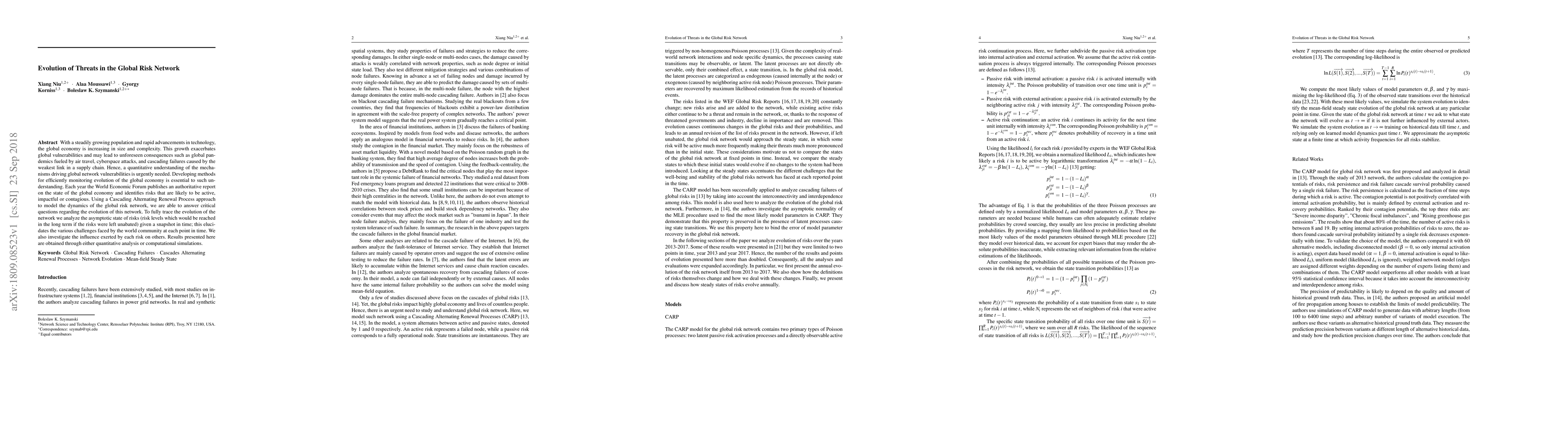 With a steadily growing population and rapid advancements in technology, the global economy is increasing in size and complexity. This growth exacerbates global vulnerabilities and may lead to unforeseen consequences such as global pandemics fueled by air travel, cyberspace attacks, and cascading failures caused by the weakest link in a supply chain. Hence, a quantitative understanding of the mechanisms driving global network vulnerabilities is urgently needed. Developing methods for efficiently monitoring evolution of the global economy is essential to such understanding. Each year the World Economic Forum publishes an authoritative report on the state of the global economy and identifies risks that are likely to be active, impactful or contagious. Using a Cascading Alternating Renewal Process approach to model the dynamics of the global risk network, we are able to answer critical questions regarding the evolution of this network. To fully trace the evolution of the network we analyze the asymptotic state of risks (risk levels which would be reached in the long term if the risks were left unabated) given a snapshot in time, this elucidates the various challenges faced by the world community at each point in time. We also investigate the influence exerted by each risk on others. Results presented here are obtained through either quantitative analysis or computational simulations.