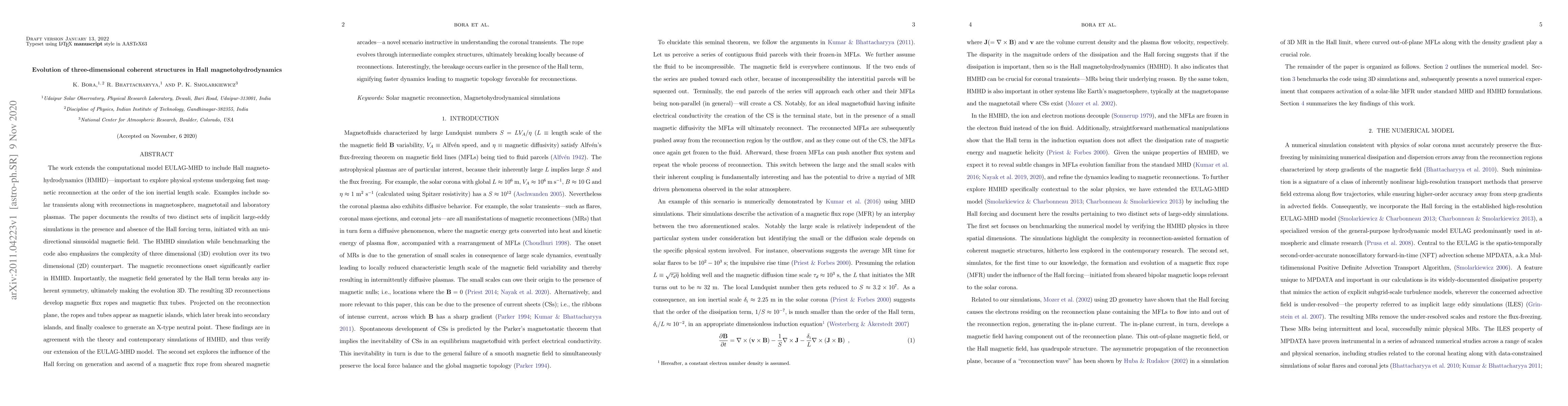 This paper extends the EULAG-MHD model to Hall magnetohydrodynamics (HMHD) and conducts large-eddy simulations to explore the evolution of 3D coherent structures during magnetic reconnection. The results show that the Hall term induces asymmetric 3D evolution, leading to the formation of magnetic flux ropes and islands, and accelerates the reconnection process.