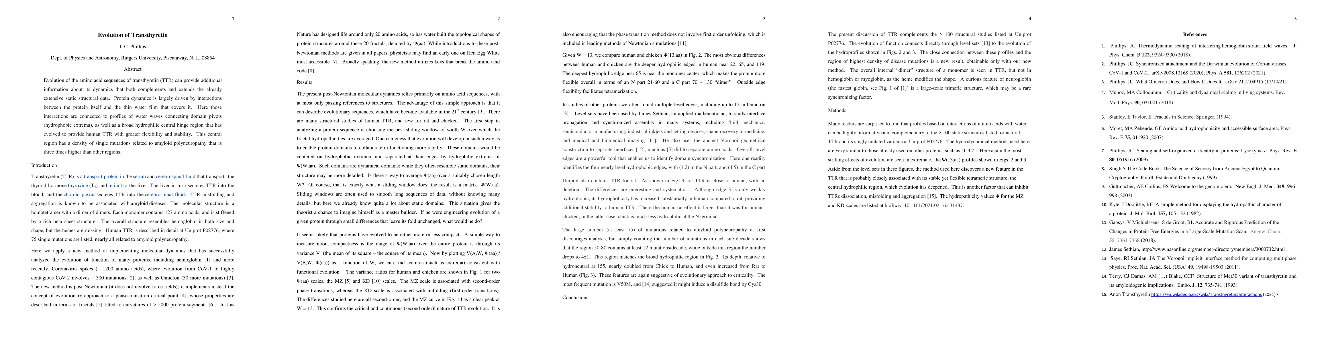 Evolution of the amino acid sequences of transthyretin (TTR) can provide additional information about its dynamics that both complements and extends the already extensive static structural data. Protein dynamics is largely driven by interactions between the protein itself and the thin water film that covers it. Here those interactions are connected to profiles of water waves connecting domain pivots (hydrophobic extrema), as well as a broad hydrophilic central hinge region that has evolved to provide human TTR with greater flexibility and stability. This central region has a density of single mutations related to amyloid polyneuropathy that is three times higher than other regions.