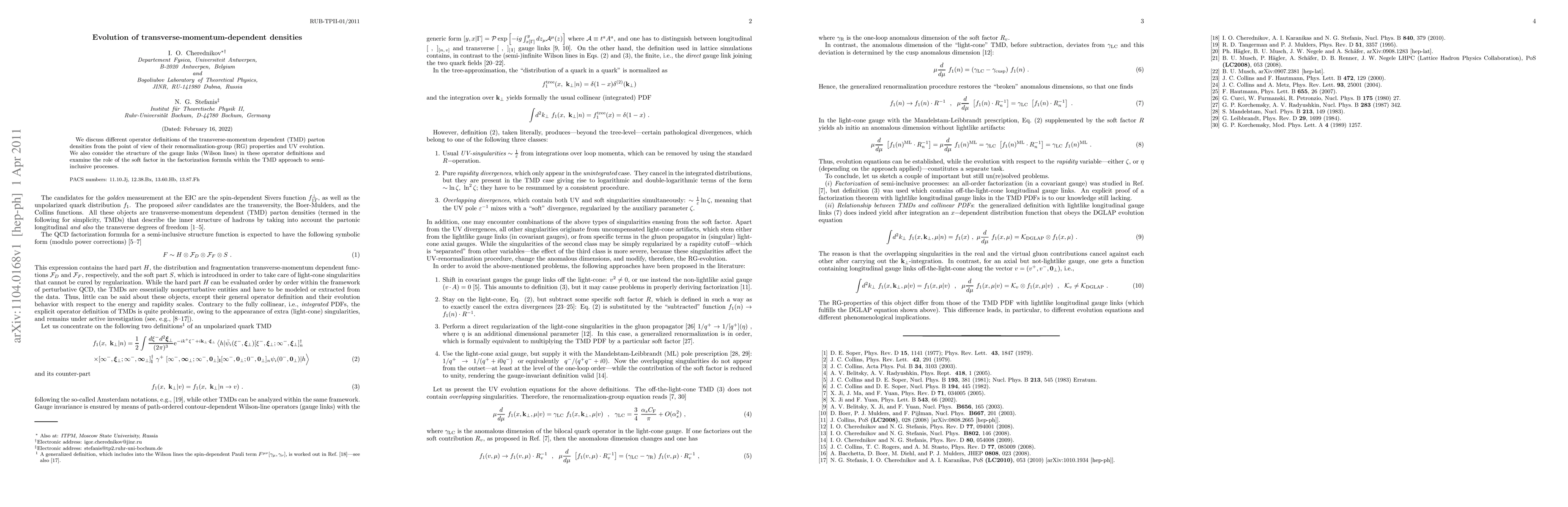 We discuss different operator definitions of the transverse-momentum dependent (TMD) parton densities from the point of view of their renormalization-group (RG) properties and UV evolution. We also consider the structure of the gauge links (Wilson lines) in these operator definitions and examine the role of the soft factor in the factorization formula within the TMD approach to semi-inclusive processes.