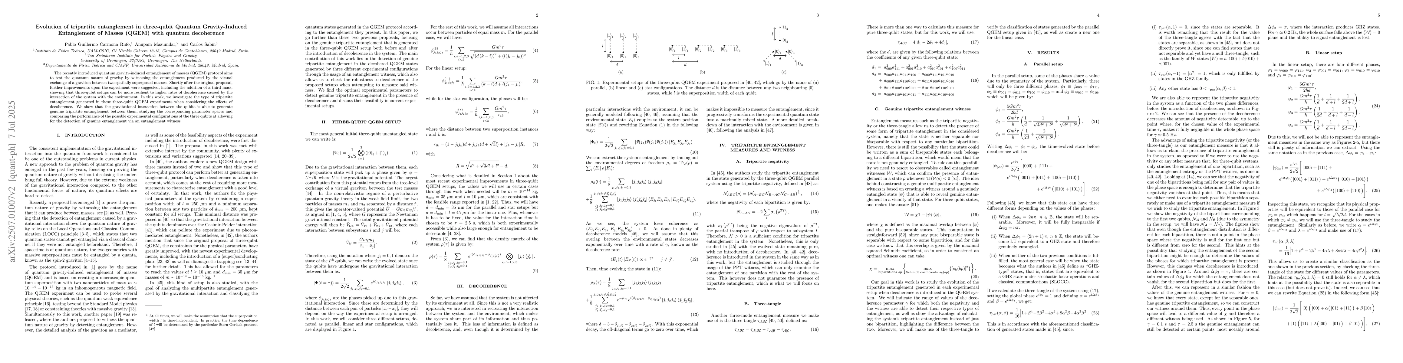 The work extends previous research by incorporating quantum decoherence effects and comparing multiple experimental setups, providing a comprehensive analysis of tripartite entanglement in QGEM systems.