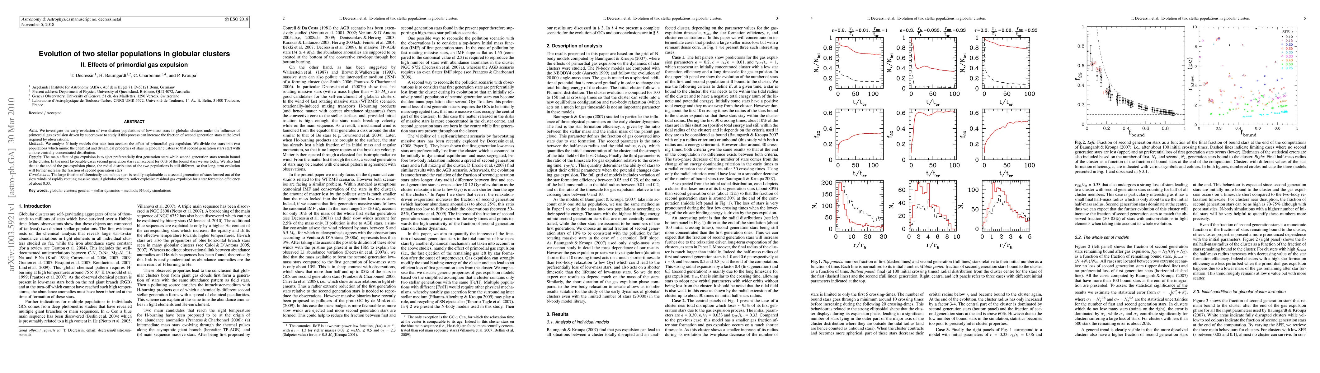 This paper examines how primordial gas expulsion from globular clusters, driven by supernovae, affects the evolution of two distinct stellar populations, finding that it can significantly increase the fraction of second generation stars to levels observed in clusters. The study suggests that second generation stars can account for up to 60% of the bound stars today, with long-term evolution further enhancing this fraction.
