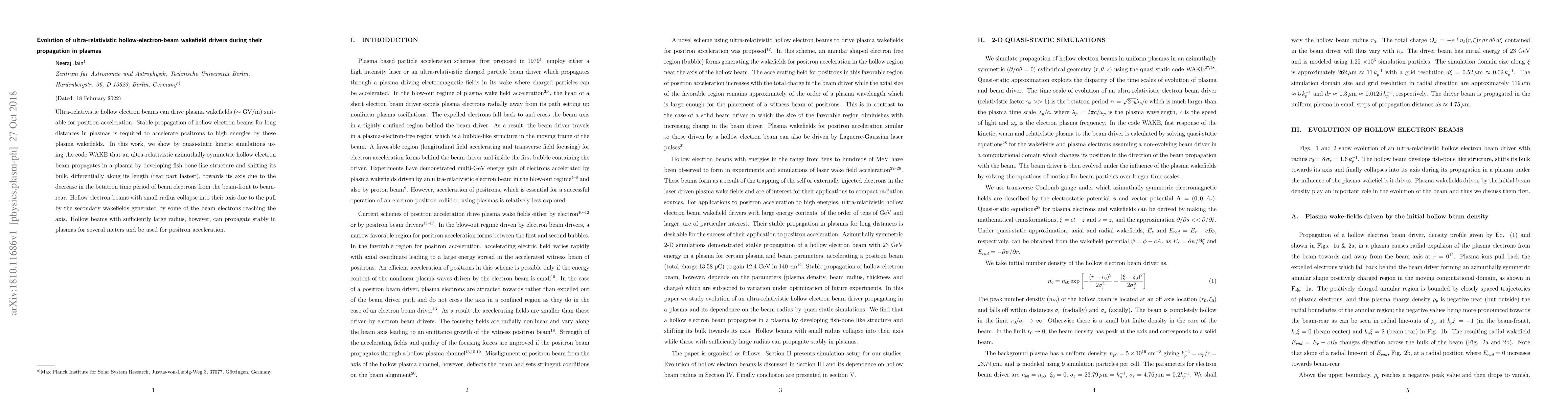 This research demonstrates that ultra-relativistic hollow electron beams can propagate stably in plasmas over long distances, driven by plasma wakefields, through simulations showing the beam's fish-bone structure and differential axial shift. Larger radius beams maintain stability, enabling high-energy positron acceleration.