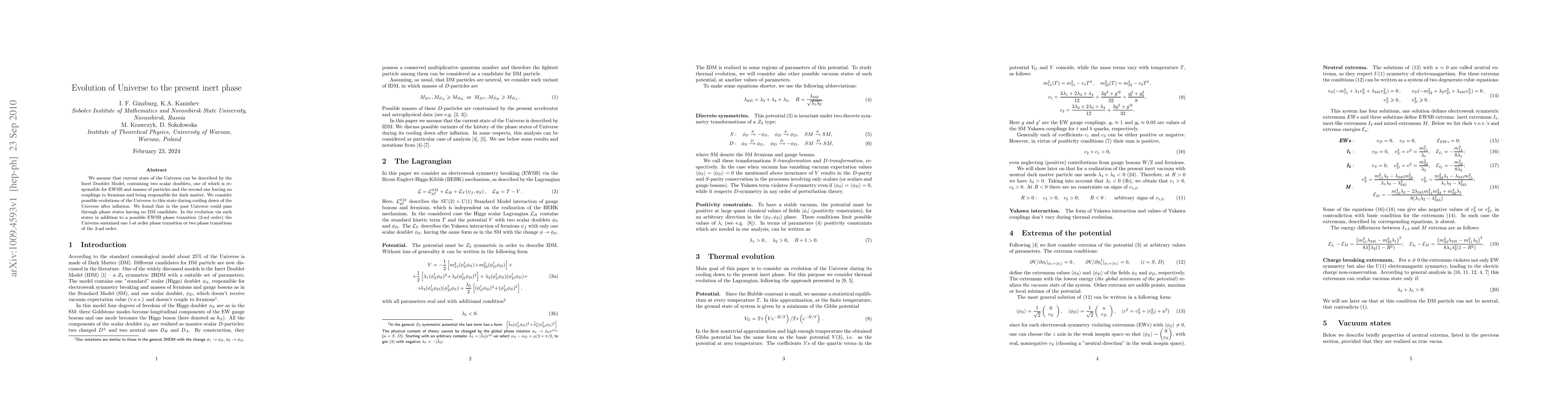 This paper explores the evolution of the Universe to its current inert phase using the Inert Doublet Model, which includes two scalar doublets: one for electroweak symmetry breaking and particle masses, and the other for dark matter. The study investigates possible evolutionary paths during the cooling phase post-inflation, revealing that the Universe may have passed through states without dark matter candidates, potentially involving a second-order electroweak phase transition and either a first-order or two second-order phase transitions.