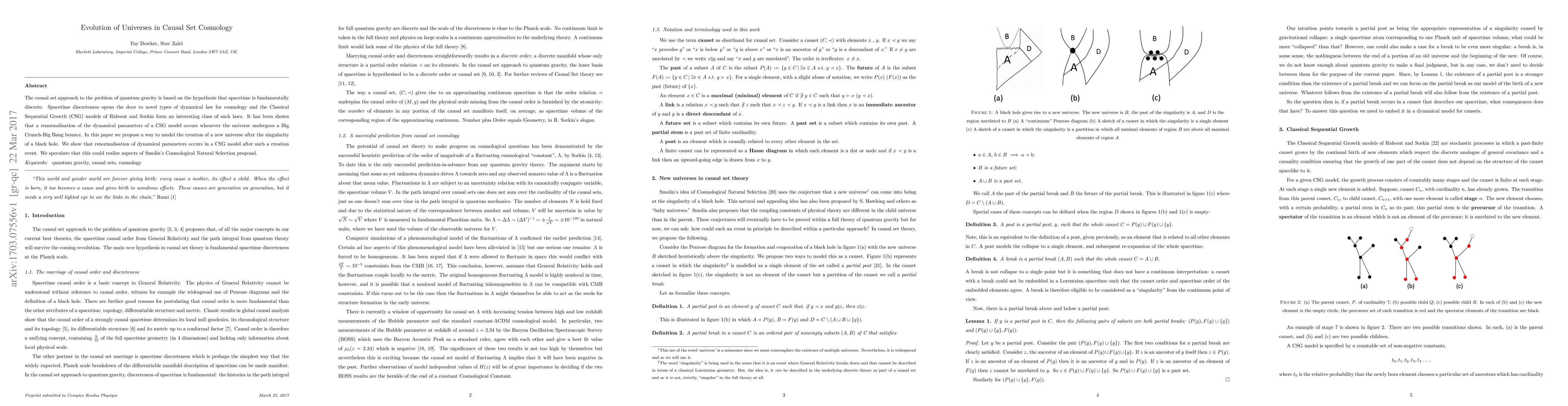This paper explores the causal set cosmology approach, proposing a model for universe creation post black hole singularity, demonstrating renormalisation of dynamical parameters akin to a Big Crunch-Big Bang bounce. It speculates this mechanism may underpin aspects of Smolin's Cosmological Natural Selection theory.