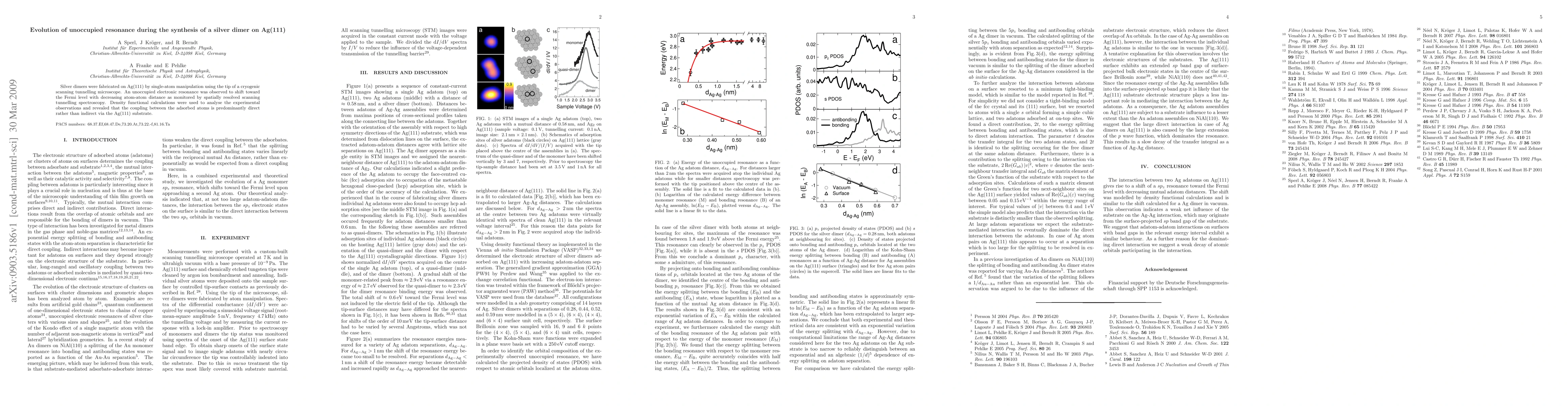Silver dimers were fabricated on Ag(111) by single-atom manipulation using the tip of a cryogenic scanning tunnelling microscope. An unoccupied electronic resonance was observed to shift toward the Fermi level with decreasing atom-atom distance as monitored by spatially resolved scanning tunnelling spectroscopy. Density functional calculations were used to analyse the experimental observations and revealed that the coupling between the adsorbed atoms is predominantly direct rather than indirect via the Ag(111) substrate.