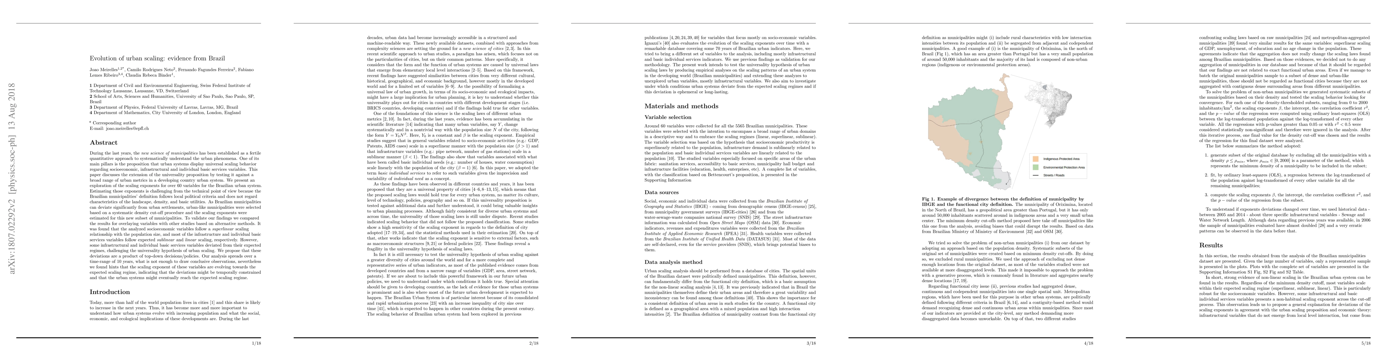 This paper explores urban scaling laws in Brazil, finding that socioeconomic variables exhibit superlinear scaling with population size, while infrastructure and services show sublinear and linear scaling respectively. Some variables deviate from expected scaling, suggesting policy influences, but hints of convergence towards expected regimes over a 10-year period suggest potential temporal resolution of these deviations.