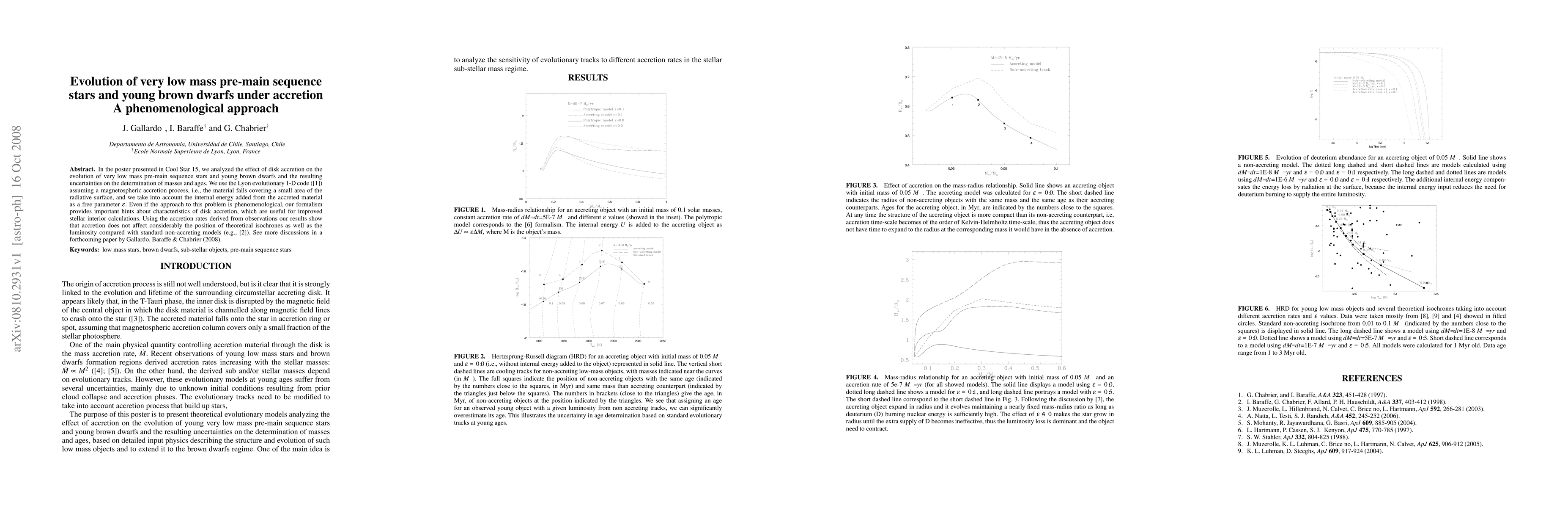 This research examines the impact of disk accretion on the evolution of very low mass pre-main sequence stars and young brown dwarfs, finding that accretion does not significantly alter theoretical isochrones or luminosity compared to non-accreting models. The study employs a phenomenological approach using the Lyon evolutionary code and suggests that accretion affects mass and age determinations.