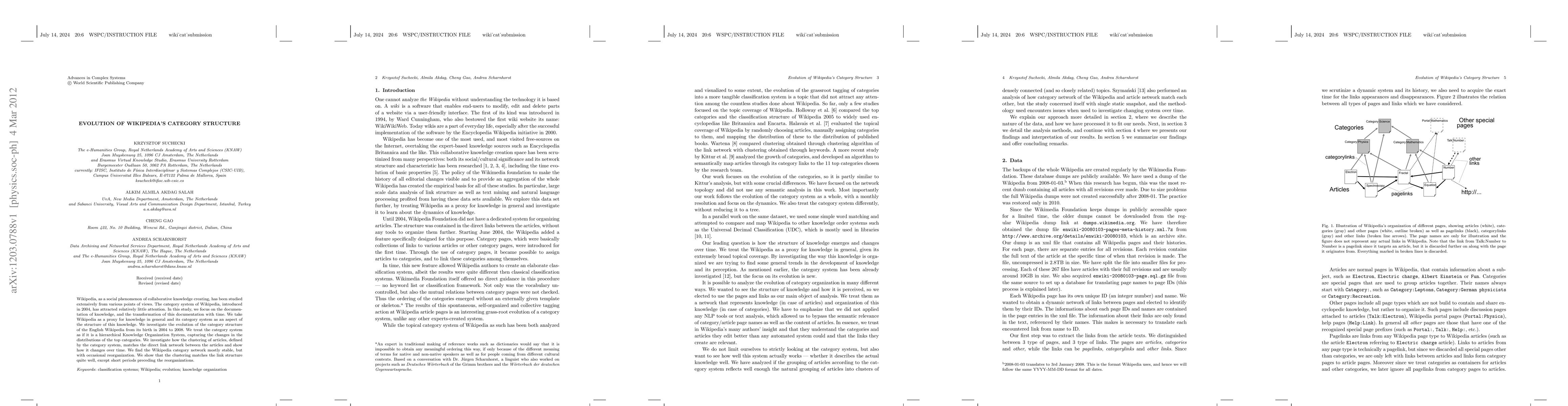 This study examines the evolution of Wikipedia's category structure between 2004 and 2008, finding that it is mostly stable but with occasional reorganization, and closely mirrors the article linking network.