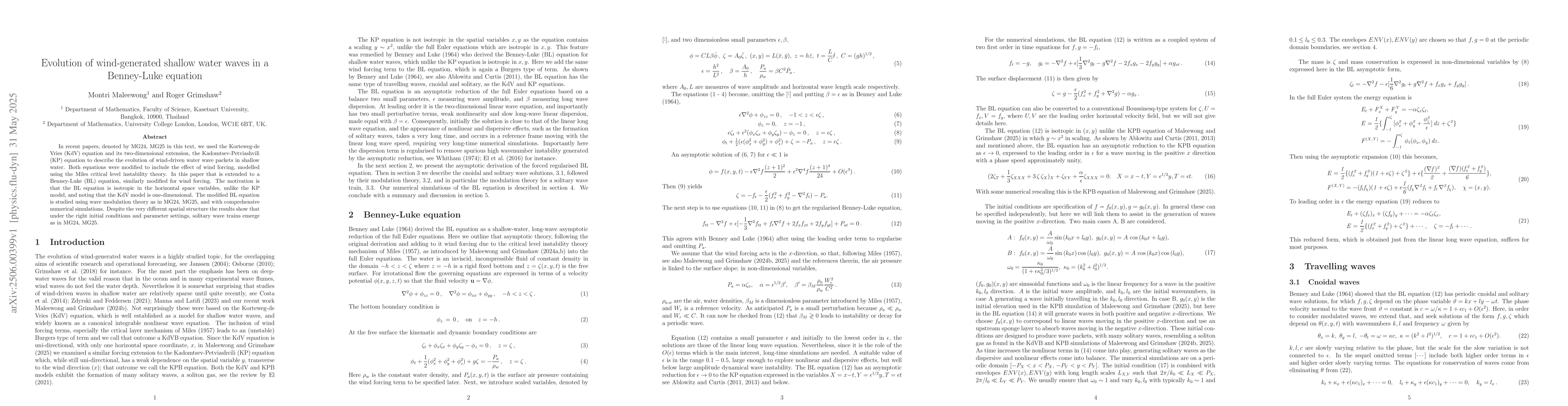 A study on wind-generated shallow water waves uses the Benney-Luke equation to describe wave packet evolution, finding solitary wave trains can emerge under specific initial conditions and parameter settings.