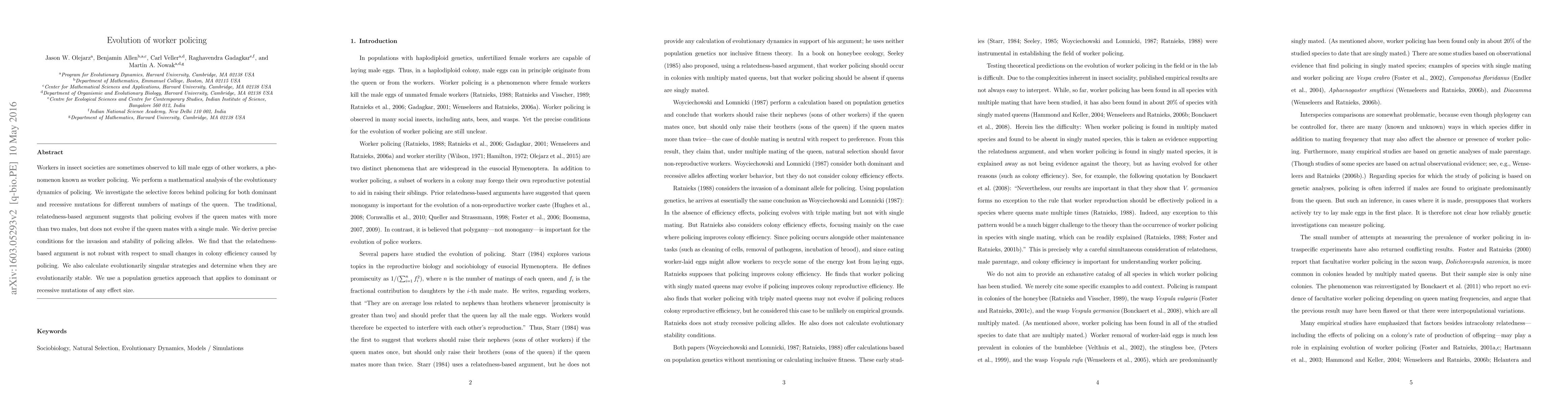 Researchers studied the evolution of worker policing in insect societies, finding that traditional arguments for its occurrence may not hold under certain conditions. They identified precise conditions for policing alleles to invade and stabilize in populations.