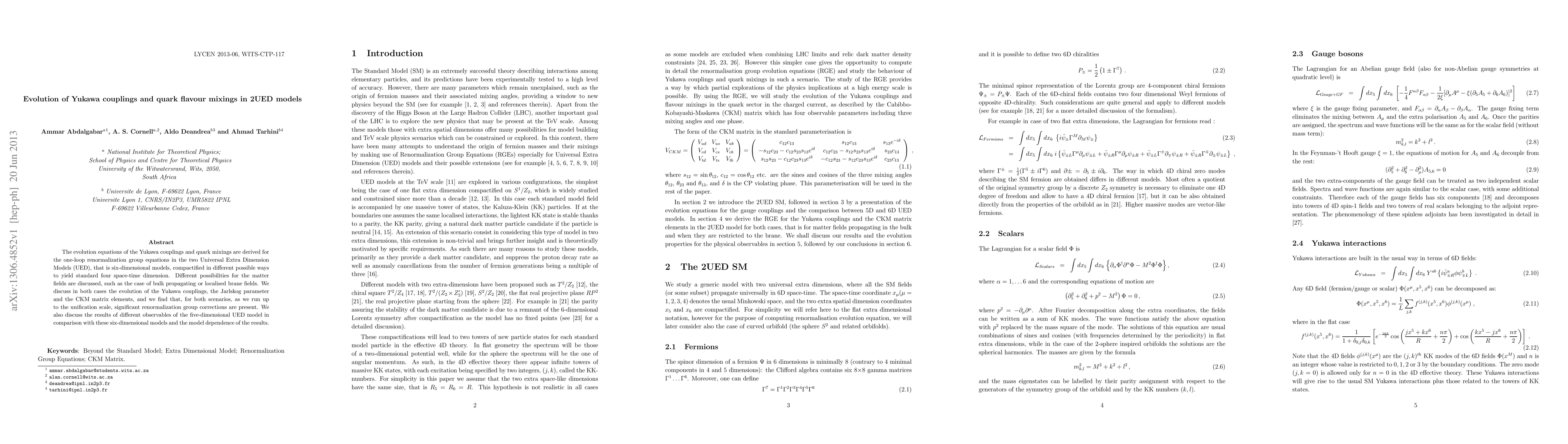 The evolution equations of the Yukawa couplings and quark mixings are derived for the one-loop renormalization group equations in the two Universal Extra Dimension Models (UED), that is six-dimensional models, compactified in different possible ways to yield standard four space-time dimension. Different possibilities for the matter fields are discussed, such as the case of bulk propagating or localised brane fields. We discuss in both cases the evolution of the Yukawa couplings, the Jarlskog parameter and the CKM matrix elements, and we find that, for both scenarios, as we run up to the unification scale, significant renormalization group corrections are present. We also discuss the results of different observables of the five-dimensional UED model in comparison with these six-dimensional models and the model dependence of the results.