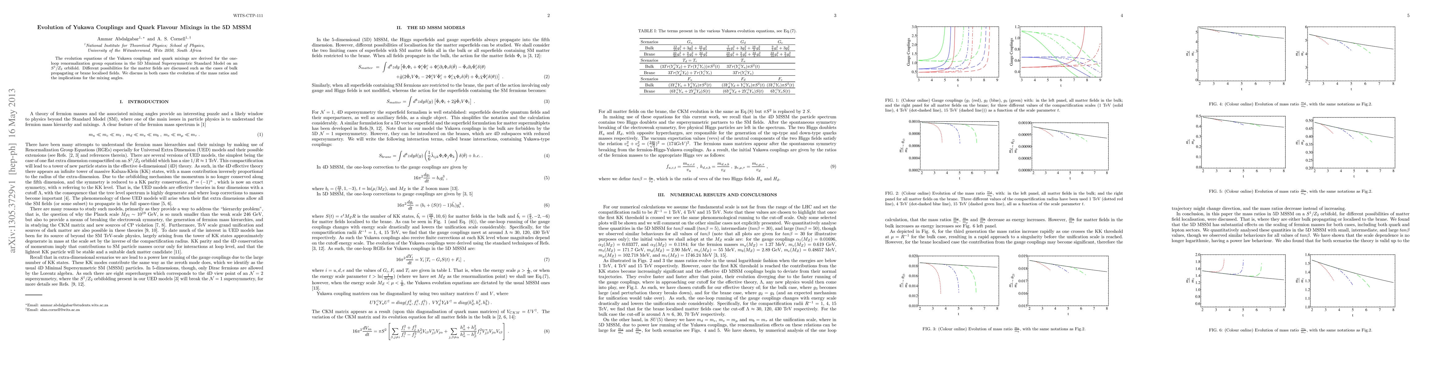 This paper derives one-loop renormalization group equations for Yukawa couplings and quark mixings in the 5D MSSM on an {$S^1 / Z_2$} orbifold, examining both bulk and brane-localized matter fields to analyze the evolution of mass ratios and their implications for mixing angles.