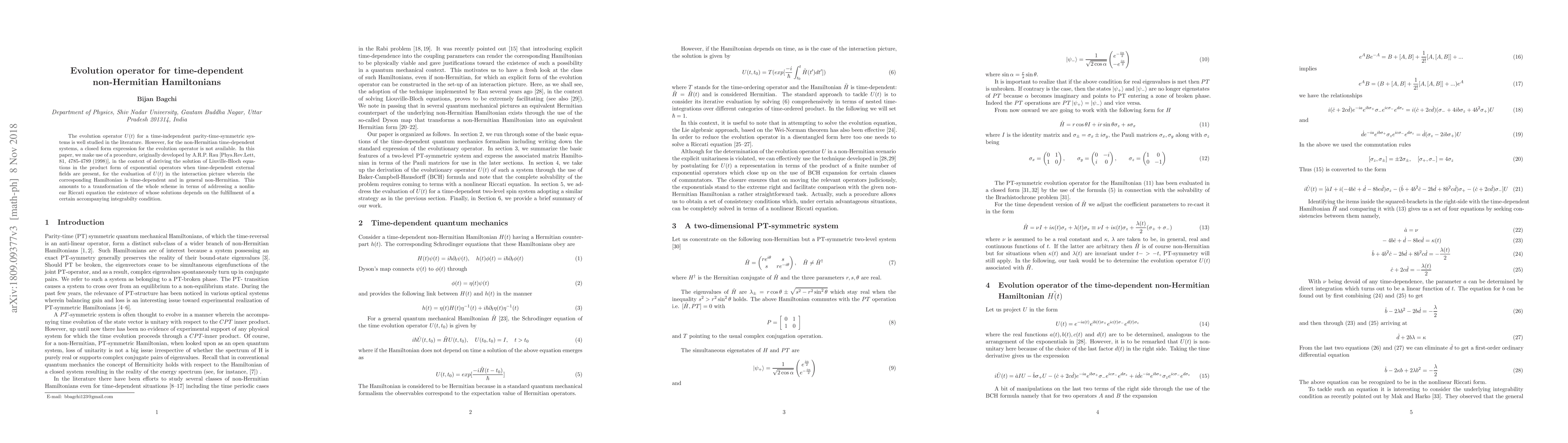 The evolution operator U(t) for a time-independent parity-time-symmetric systems is well studied in the literature. However, for the non-Hermitian time-dependent systems, a closed form expression for the evolution operator is not available. In this paper, we make use of a procedure, originally developed by A.R.P. Rau [Phys.Rev.Lett, 81, 4785-4789 (1998)], in the context of deriving the solution of Liuville-Bloch equations in the product form of exponential operators when time-dependent external fields are present, for the evaluation of U(t) in the interaction picture wherein the corresponding Hamiltonian is time-dependent and in general non-Hermitian. This amounts to a transformation of the whole scheme in terms of addressing a nonlinear Riccati equation the existence of whose solutions depends on the fulfillment of a certain accompanying integrabilty condition.