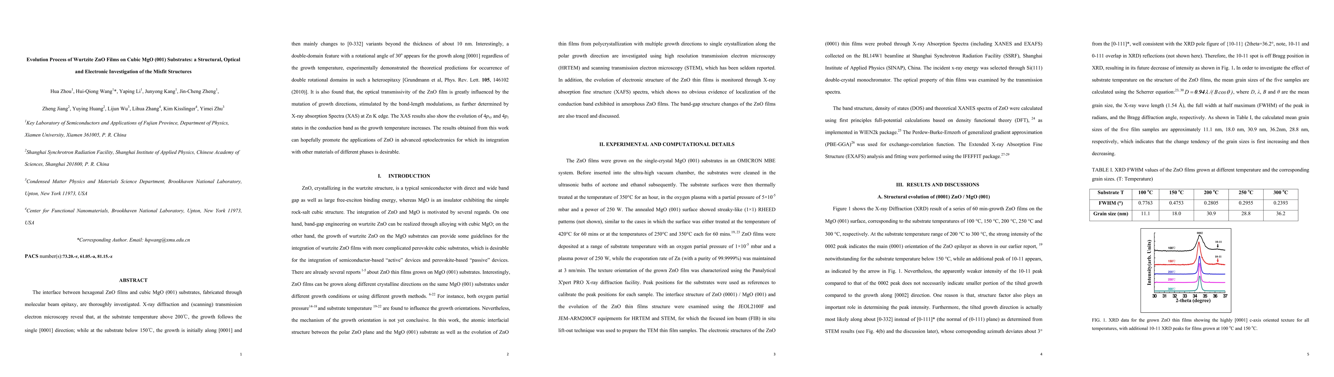 The interface between hexagonal ZnO films and cubic MgO (001) substrates, fabricated through molecular beam epitaxy, are thoroughly investigated. X-ray diffraction and (scanning) transmission electron microscopy reveal that, at the substrate temperature above 200 degree C, the growth follows the single [0001] direction; while at the substrate below 150 degree C, the growth is initially along [0001] and then mainly changes to [0-332] variants beyond the thickness of about 10 nm. Interestingly, a double-domain feature with a rotational angle of 30 degree appears for the growth along [0001] regardless of the growth temperature, experimentally demonstrated the theoretical predictions for occurrence of double rotational domains in such a heteroepitaxy [Grundmann et al, Phys. Rev. Lett. 105, 146102 (2010)]. It is also found that, the optical transmissivity of the ZnO film is greatly influenced by the mutation of growth directions, stimulated by the bond-length modulations, as further determined by X-ray absorption Spectra (XAS) at Zn K edge. The XAS results also show the evolution of 4pxy and 4pz states in the conduction band as the growth temperature increases. The results obtained from this work can hopefully promote the applications of ZnO in advanced optoelectronics for which its integration with other materials of different phases is desirable.