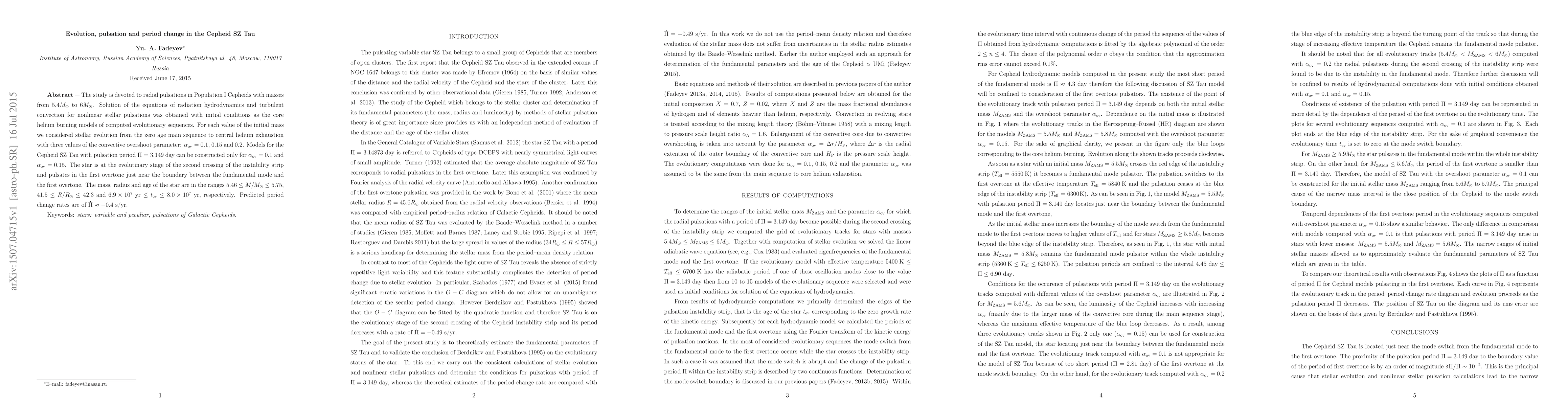 The research models the radial pulsations in Cepheid stars with masses between 5.4 to 6 solar masses, using radiation hydrodynamics and turbulent convection. For SZ Tau, a specific Cepheid, models were created with convective overshoot parameters of 0.1 and 0.15, placing it in the second crossing of the instability strip, pulsating in the first overtone close to the fundamental mode boundary. The star's estimated mass, radius, and age range from 5.46 to 5.75, 41.5 to 42.3, and 6.9e7 to 8.0e7 years, respectively, with a predicted period decrease of -0.4 s/yr.