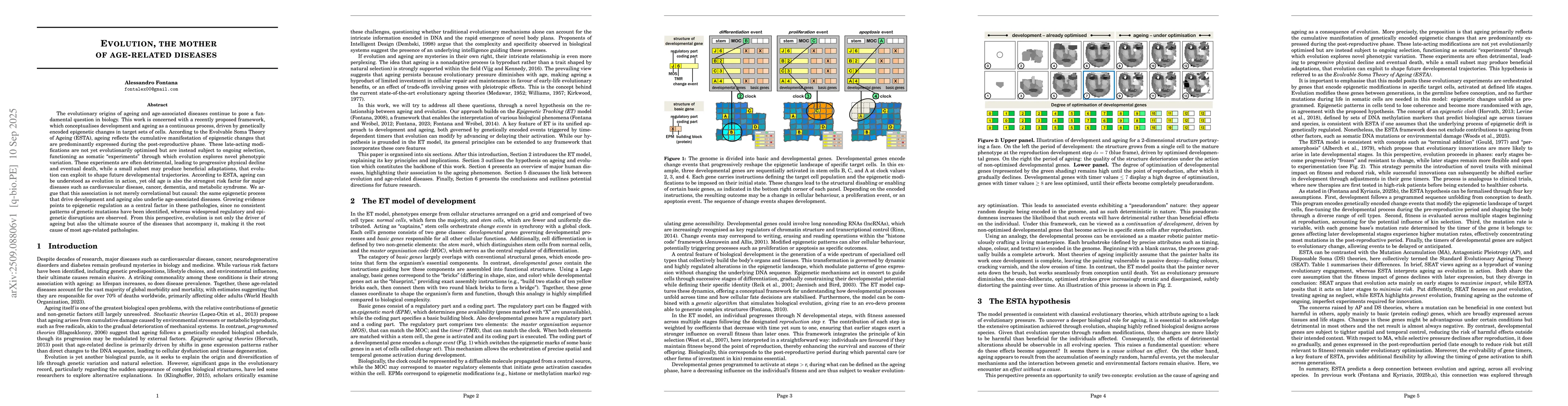 The evolutionary origins of ageing and age-associated diseases continue to pose a fundamental question in biology. This study is concerned with a recently proposed framework, which conceptualises development and ageing as a continuous process, driven by genetically encoded epigenetic changes in target sets of cells. According to the Evolvable Soma Theory of Ageing (ESTA), ageing reflects the cumulative manifestation of epigenetic changes that are predominantly expressed during the post-reproductive phase. These late-acting modifications are not yet evolutionarily optimised but are instead subject to ongoing selection, functioning as somatic "experiments" through which evolution explores novel phenotypic variation. These experiments are often detrimental, leading to progressive physical decline and eventual death, while a small subset may produce beneficial adaptations, that evolution can exploit to shape future developmental trajectories. According to ESTA, ageing can be understood as evolution in action, yet old age is also the strongest risk factor for major diseases such as cardiovascular diseases, cancer, neurodegenerative disorders, and metabolic syndrome. We argue that this association is not merely correlational but causal: the same epigenetic process that drive development and ageing also underlie age-associated diseases. Growing evidence points to epigenetic regulation as a central factor in these pathologies, since no consistent patterns of genetic mutations have been identified, whereas widespread regulatory and epigenetic disruptions are observed. From this perspective, evolution is not only the driver of ageing but also the ultimate source of the diseases that accompany it, making it the root cause of most age-related pathologies.